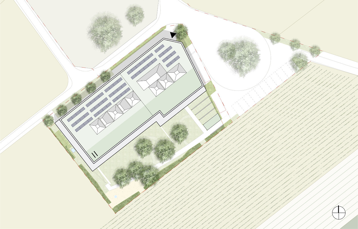 Ausgehend von diesem Status Quo stellt der Gebäudeentwurf eine idealisierte Fortführung der Geländetopografie dar, d.h. es wird das Bild gewählt, welches die Erdscholle entgegen der Hangneigung leicht löst und aufwölbt, darüber geht die Vegetation nahtlos in die Dachlandschaft über. Aufgrund der Hangneigung stellt sich die „Erdscholle“ hangseitig als Erdgeschoss dar und talseitig als Obergeschoss, mitsamt seinen Aufenthaltsräumen für die Kindertagesstätte. Darunter führt die Erschließungsebene höhengleich von der Straße nahtlos ins Eingangsfoyer über.