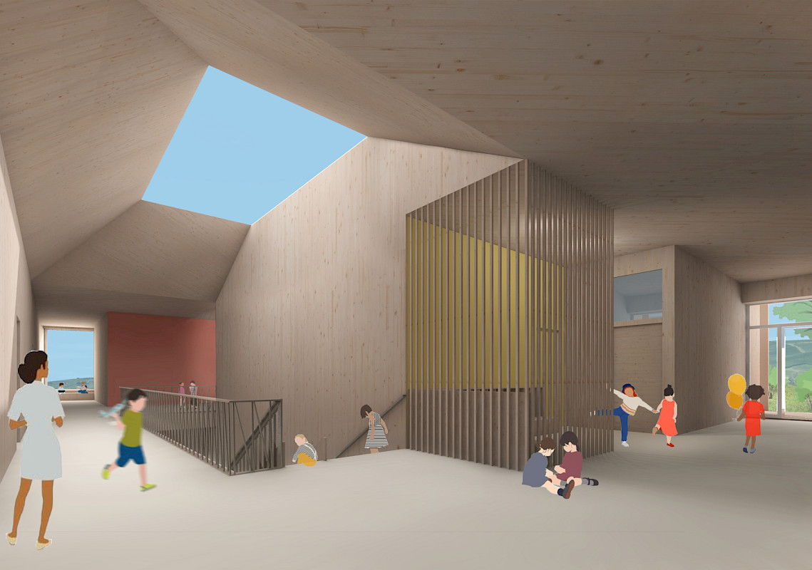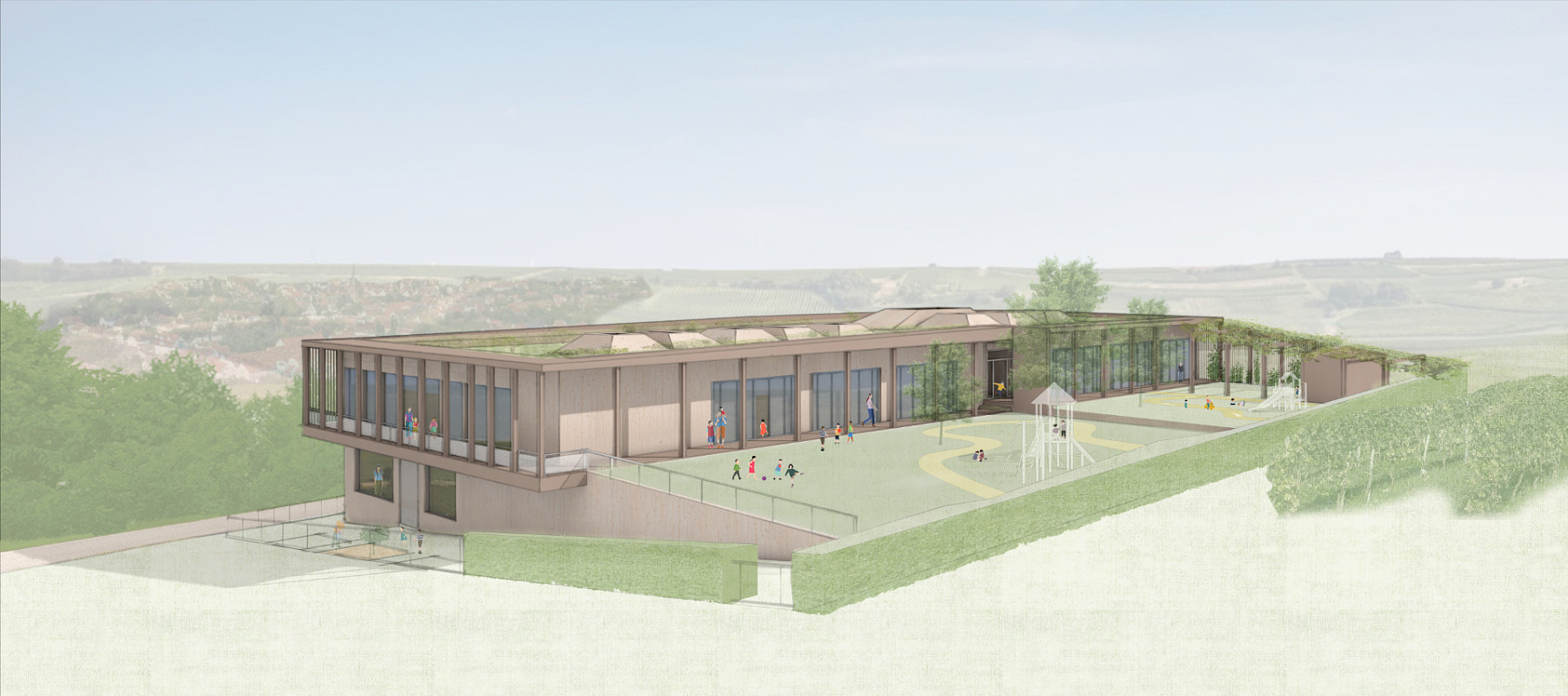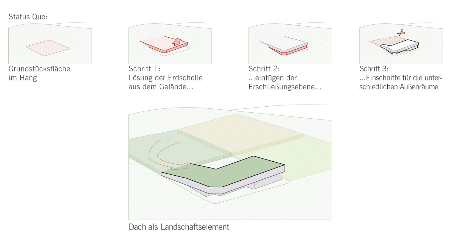 Ausgehend von diesem Status Quo stellt der Gebäudeentwurf eine idealisierte Fortführung der Geländetopografie dar, d.h. es wird das Bild gewählt, welches die Erdscholle entgegen der Hangneigung leicht löst und aufwölbt, darüber geht die Vegetation nahtlos in die Dachlandschaft über. Aufgrund der Hangneigung stellt sich die „Erdscholle“ hangseitig als Erdgeschoss dar und talseitig als Obergeschoss, mitsamt seinen Aufenthaltsräumen für die Kindertagesstätte. Darunter führt die Erschließungsebene höhengleich von der Straße nahtlos ins Eingangsfoyer über.