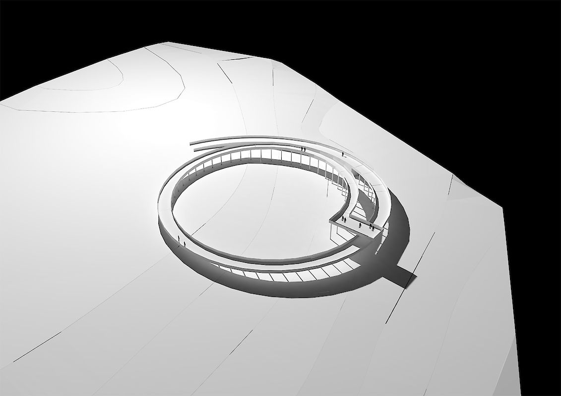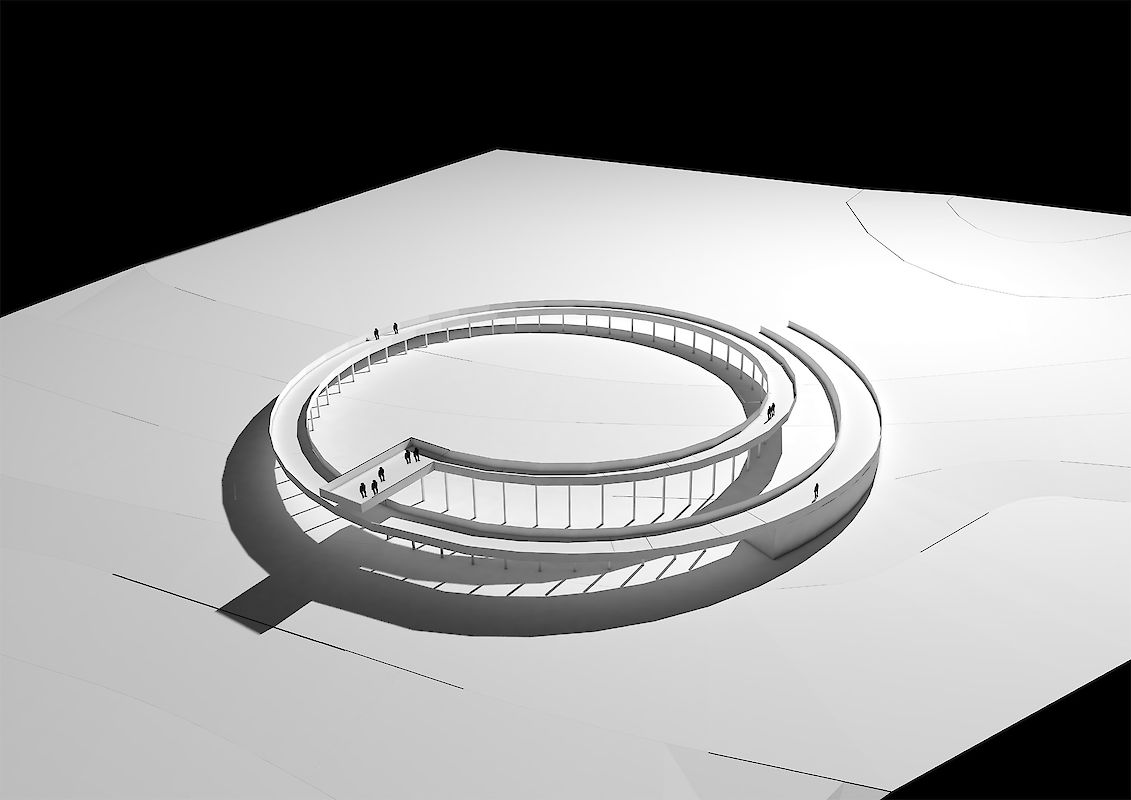 An der südlichen Hangkante des Rachtinger Plateaus löst sich ein kreisförmiger Weg mit ca. 70 m Durchmesser und einer Gesamtlänge von 300 Metern aus der Landschaft. Durch seine bis zu zwei Drittel und ca. 50 m über die Hangseite auskragende Lage wird das Hinaufschreiten zum spektakulären Spiel mit der Höhe und der Landschaft. Am Ende des Weges angekommen erwartet den Besucher eine großzügige Aussichtsebene. Diese bricht abrupt den kreisförmigen Verlauf des Weges. Als richtungsweisende Geste, gleich eines zeigenden Fingers, wird der Blick des „Gehenden“ gezielt auf die einzigartige Schönheit der Landschaft gelenkt. Die ca. 3 m über dem Plateau und ca. 7 m über dem Hang schwebenden Aussichtskanzel wird alleine über die nahezu gefällelose Wegelänge (ca. 1 %) erreicht. Das Hinaufschreiten geschieht mit Ruhe und bietet Raum für das Erleben und das Fließen der Gedanken. Selbst dem stark motorisch eingeschränkten Besucher wird die Möglichkeit geboten, die Kanzel zu erreichen. Hier lädt ein großzügiges Sitzelement, das zu allen Seiten den Ausblick ermöglicht, zum ruhenden Erleben ein. Die aufgeständerte Skulptur lässt die Landschaft unter sich hindurchfließen. Der dortige Landschaftstyp der Besenginsterheide kann dadurch geschützt werden und sich weiterentwickeln. Ebenso kann der Niederwald, der das Planungsgebiet derzeit noch scharf abgrenzt, sich durch gezielte Ausweisung von Entwicklungsflächen in den nördlichen Bereich ausdehnen und mit der Besenginsterheide verzahnen.
