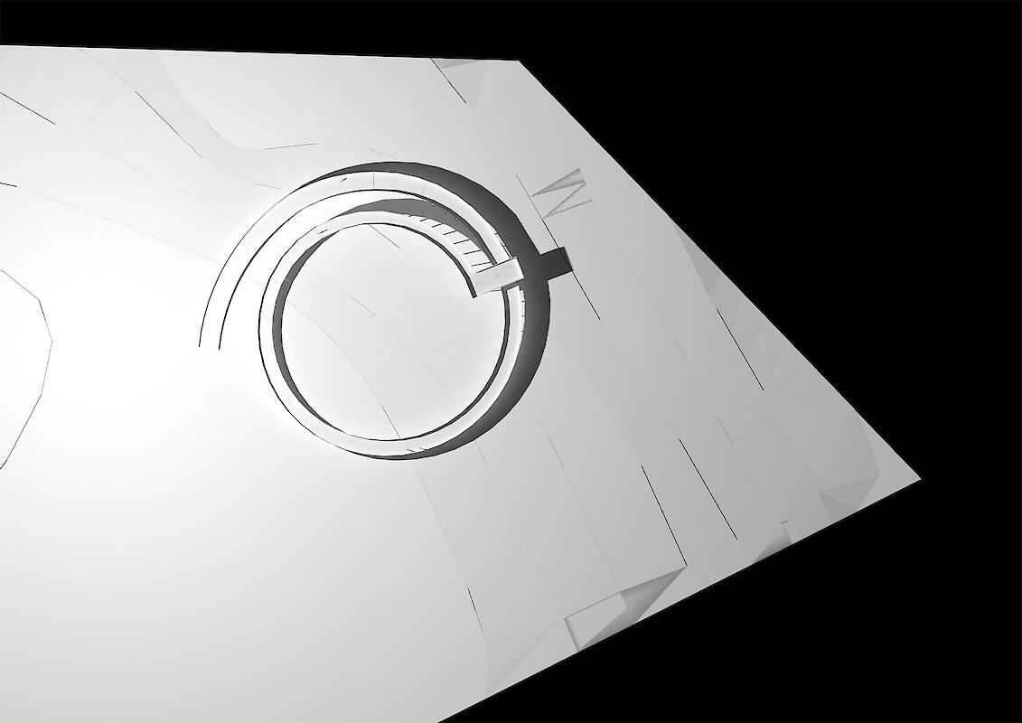 Die genannten Nutzungen bilden auf einer quadratischen Grundfläche ein Ensemble aus zwei Einzelhäusern und einer waagrechten Plattform, welche sich an den Rändern sanft in das Gefälle einsetzt, d.h. an den Rändern gibt es höhengleiche Übergänge oder ein bis drei Stufen auf- oder abwärts.