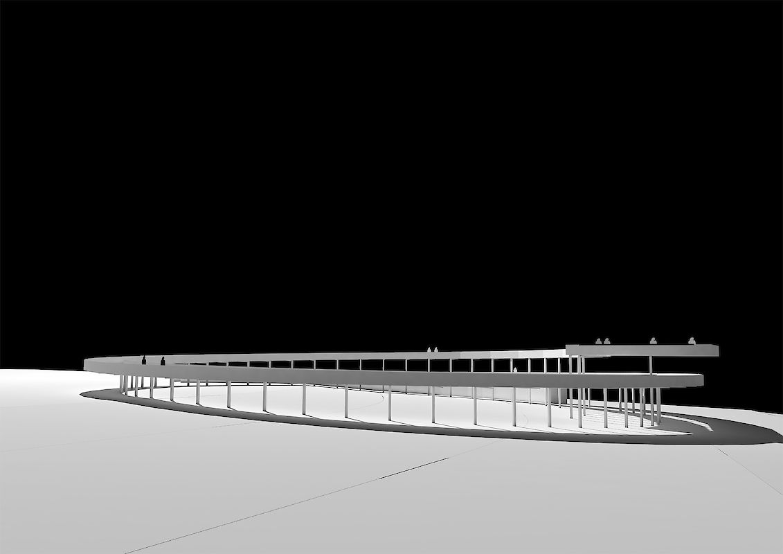 Die genannten Nutzungen bilden auf einer quadratischen Grundfläche ein Ensemble aus zwei Einzelhäusern und einer waagrechten Plattform, welche sich an den Rändern sanft in das Gefälle einsetzt, d.h. an den Rändern gibt es höhengleiche Übergänge oder ein bis drei Stufen auf- oder abwärts.