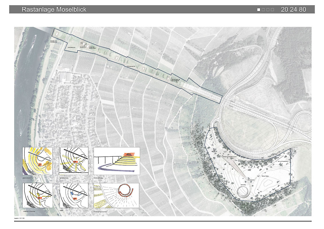 Der Parkplatz, ist für ca. 50 PKW und ca. 10 Reisebusse ausgelegt. An seinem nördlichen Ende auf einer etwaigen Höhe von 270 m ü. NN befindet sich die Rastanlage. Dieser Bereich wird als keilförmiger Einschnitt in die Topographie behutsam eingefügt. Einem durchschnittenem Felsrelief gleich, fassen lagerhafte Schiefermauern, größtenteils als dosierte Trockenmauern ausgebildet, das seitliche Gelände. Der südliche Geländeeinschnitt (Schiefermauer) erreicht in Höhe der Rastanlage seine maximale Höhe von ca. 3 m gegenüber dem südlich angrenzendem Gelände. An dieser Stelle sind die erforderlichen Anlagen der Rastanlage (WC, Wickelraum, Cafebox etc.) in das Gelände hineingeschoben, somit in den Hang integriert. Diesem Bereich ist ein großzügiger Vorplatz zugeordnet, der auch bei starker Frequentierung des Ortes Entwicklungen u.B. als Sommercafé etc. zulässt.