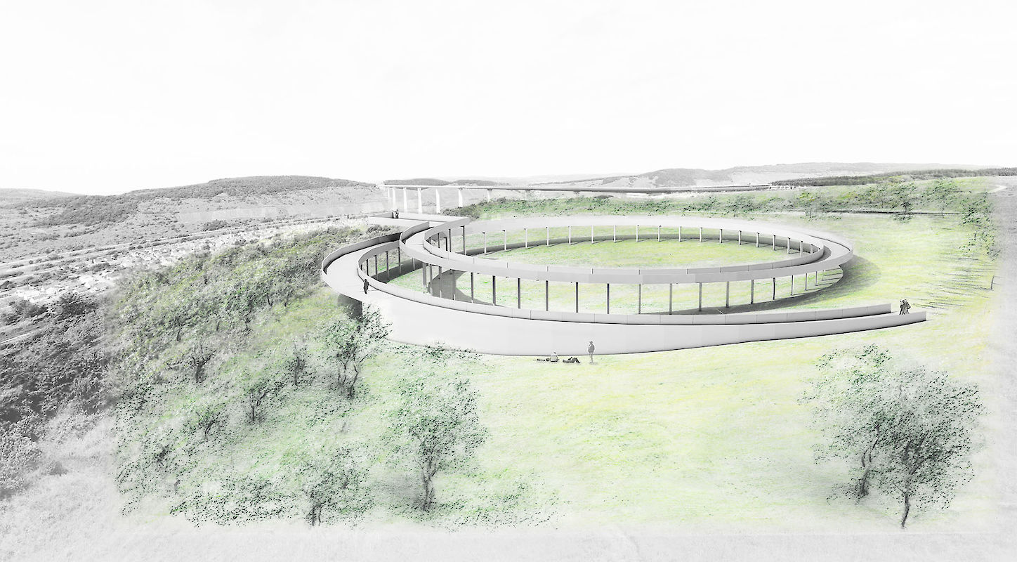 An der südlichen Hangkante des Rachtinger Plateaus löst sich ein kreisförmiger Weg mit ca. 70 m Durchmesser und einer Gesamtlänge von 300 Metern aus der Landschaft. Durch seine bis zu zwei Drittel und ca. 50 m über die Hangseite auskragende Lage wird das Hinaufschreiten zum spektakulären Spiel mit der Höhe und der Landschaft. Am Ende des Weges angekommen erwartet den Besucher eine großzügige Aussichtsebene. Diese bricht abrupt den kreisförmigen Verlauf des Weges. Als richtungsweisende Geste, gleich eines zeigenden Fingers, wird der Blick des „Gehenden“ gezielt auf die einzigartige Schönheit der Landschaft gelenkt. Die ca. 3 m über dem Plateau und ca. 7 m über dem Hang schwebenden Aussichtskanzel wird alleine über die nahezu gefällelose Wegelänge (ca. 1 %) erreicht. Das Hinaufschreiten geschieht mit Ruhe und bietet Raum für das Erleben und das Fließen der Gedanken. Selbst dem stark motorisch eingeschränkten Besucher wird die Möglichkeit geboten, die Kanzel zu erreichen. Hier lädt ein großzügiges Sitzelement, das zu allen Seiten den Ausblick ermöglicht, zum ruhenden Erleben ein. Die aufgeständerte Skulptur lässt die Landschaft unter sich hindurchfließen. Der dortige Landschaftstyp der Besenginsterheide kann dadurch geschützt werden und sich weiterentwickeln. Ebenso kann der Niederwald, der das Planungsgebiet derzeit noch scharf abgrenzt, sich durch gezielte Ausweisung von Entwicklungsflächen in den nördlichen Bereich ausdehnen und mit der Besenginsterheide verzahnen.