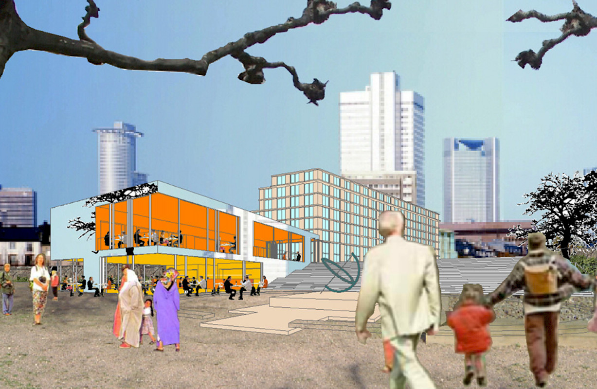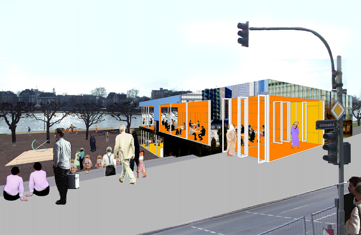 Das Wettbewerbsgelände ist durch das Kreuzen der Stadträume Anlagenring und Nizza-Anlagen gekennzeichnet. Das Mitarbeiterrestaurant auf Stadtebene wird Teil des Anlagenring-Aussenraumes. Durch das öffentliche Restaurant läuft der Aussenraum der Nizza-Anlagen hindurch. Dieser Kreuzungspunkt beider hochwertiger Stadträume ist im Grunde nicht bebaubar. Hier kann kein Gebäude entstehen, welches allgemeinen Architekturkriterien wie Maßstäblichkeit, Fassadenproportion und –Detaillierung unterworfen ist. Das hier vorgeschlagene Volumen nimmt sich durch seine reflektierende Aussenhaut (Edelstahl poliert) zurück. Sowohl tagsüber, als auch nachts bleiben die Restauranträume als Teil der jeweiligen Aussenräume erlebbar. Auf der großen, tribünenartigen Treppenanlage wird die Hastigkeit der Stadt auf die Beschaulichkeit der Uferanlagen transformiert.