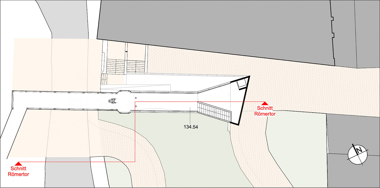 Die beiden erhaltenen Mauerabschnitte werden durch das Römertor und die Coulinstraße geteilt und sind differenziert zu betrachten. Durch eine leichte Stahlabdeckung im oberen Mauerabschnitt wird das ursprüngliche Erscheinungsbild erhalten und der Witterungsschutz gewährleistet. Die Betonkissen für die Abdeckung des oberen Mauerabschnitts greifen nicht in die vorhandene Mauer ein. Das Schutzdach des unteren Mauerabschnitts dient mit seiner Doppelnutzung auch als Erschließungszone für einen barrierefreien Übergang zwischen Innenstadt, Coulinstraße und Schulberg.