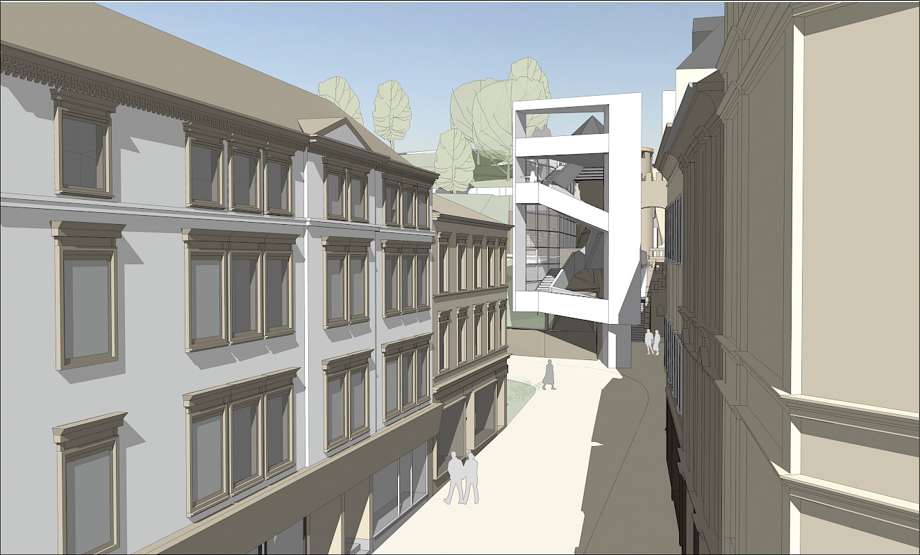 Also schlagen die Verfasser einen synergetischen Ansatz vor, bei welchem die Eigenschaften der unterschiedlichen Komponenten als Ganzes zusammenwirken. Das bestehende Wegesystem auf dem Schulberg wird mit Serpentinen barrierefrei ergänzt und an die brückenartige Verbindung des Römertors über die Coulinstraße angeschlossen. Von dort führt ein Steg (Dachfläche/Wetterschutz Römermauer) mit einem Treppen- und Aufzugsturm zur Fußgängerzone. Mit dieser Doppelfunktion wird nicht nur der Wetterschutz der unteren Römermauer sichergestellt, sondern zudem auch die barrierefreie Erschließung vom Schulberg zur Innenstadt und auf der Spitze des Erschließungsturmes ergibt sich eine Plattform mit Panoramablick über die Dachlandschaft von Wiesbaden.