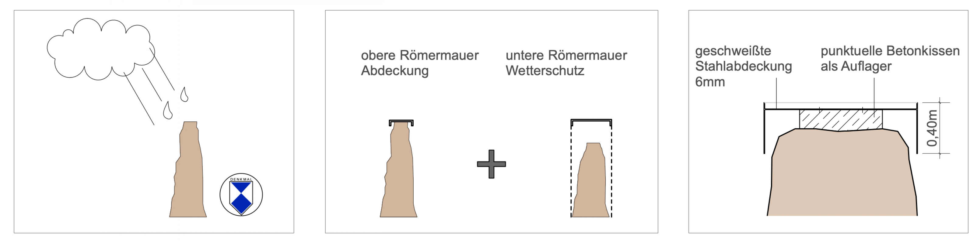 Für den oberen Bereich der Römermauer wird eine Stahlabdeckung vorgeschlagen, welche nur auf punktuellen Betonkissen befestigt wird, welche durch ihr Eigengewicht als Auflager dienen und Stabilität gewährleisten. Der filigrane Wetterschutz im unteren Mauerabschnitt endet im Osten mit einem offenen Treppen- und Aufzugsturm als barrierefreie Wegeverbindung. Der Treppenverlauf bietet eine didaktisch interessante Folge von Blicken auf die Römermauer und endet mit einer Aussichtsterrasse mit Blick über die Innenstadt von Wiesbaden. Als Nord- und Südfassade leistet ein weitmaschiger Gitterrost den Witterungsschutz ohne die Mauer räumlich zu verhüllen.