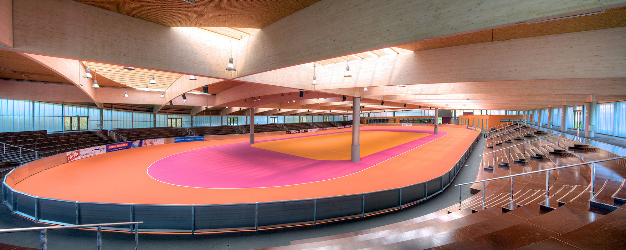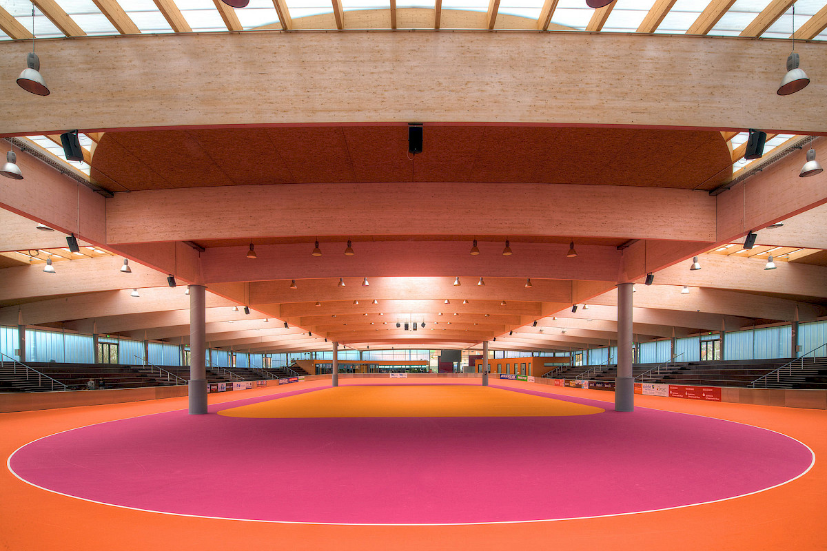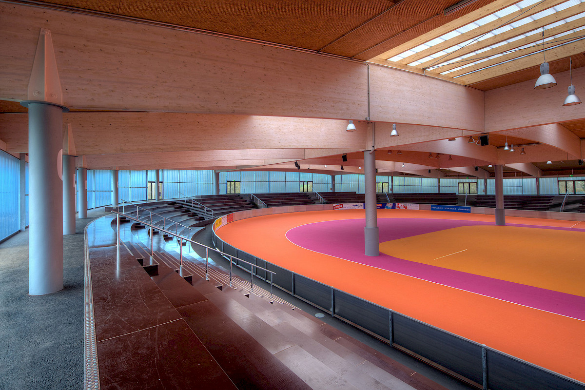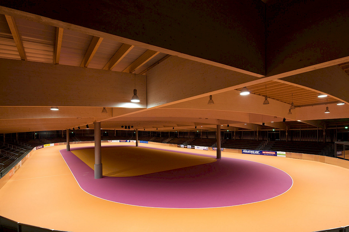 By night the arena Geisingen glows like a UFO against the Geisingen countryside. The translucent walls are almost weightless and surround the arena. The flat roof constructed with wood and the same weightless material as the sidewalls covers the entire arena. The designer Monika Heiss set the sensational orange tone for the track and the radiant Magenta for the training track. These brilliant colours and the lighting concept create an exciting motivational atmosphere. It does not matter if the weather is bad, if it is a foggy day, or night time, the atmosphere in the arena is always enjoyable. For the Bistro, Skateshop and the Service areas, the natural colour ochre was chosen.