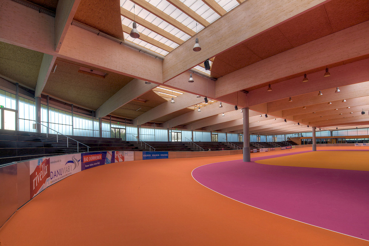 Interessant ist, dass durch die gewählte Bauweise der gesamte Energiebedarf für den Hallenraum alleine über abstrahlende Erdwärme und über den Sonnenenergieeintrag durch die transluzenten Dach- und Fassaden gedeckt wird. Im vergangenen Winter fiel die Temperatur in der Halle nie unter 8°C, meist lag sie über 10°C und das ohne jeden Energieaufwand! Lediglich der Shop, das Bistro und die Umkleiden/Sanitärräume werden beheizt. Die Betriebskosten verhalten sich gegenüber vergleichbaren Hallen sehr gering