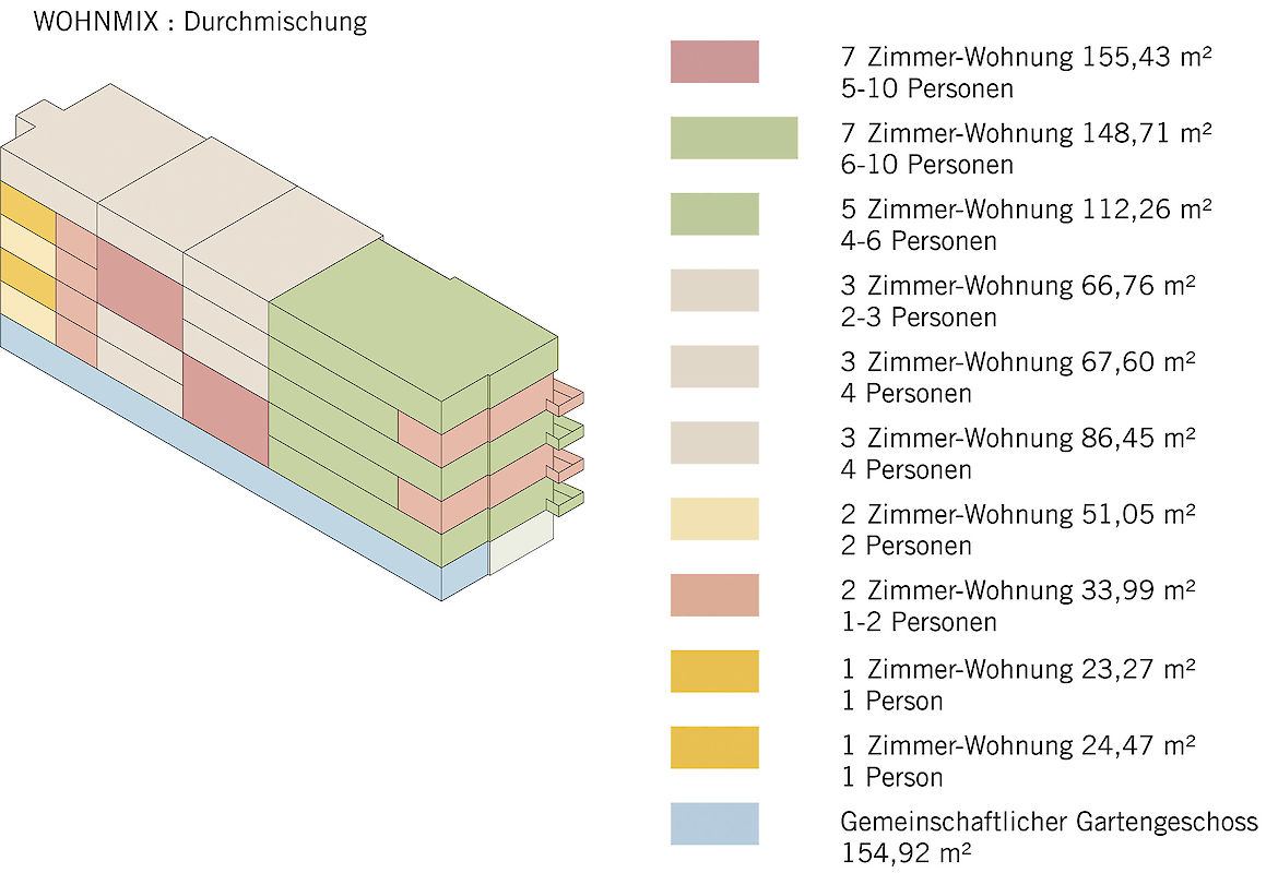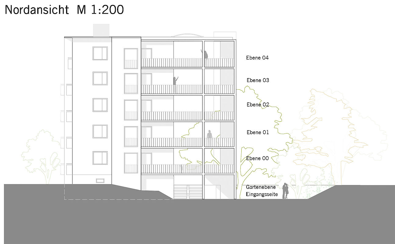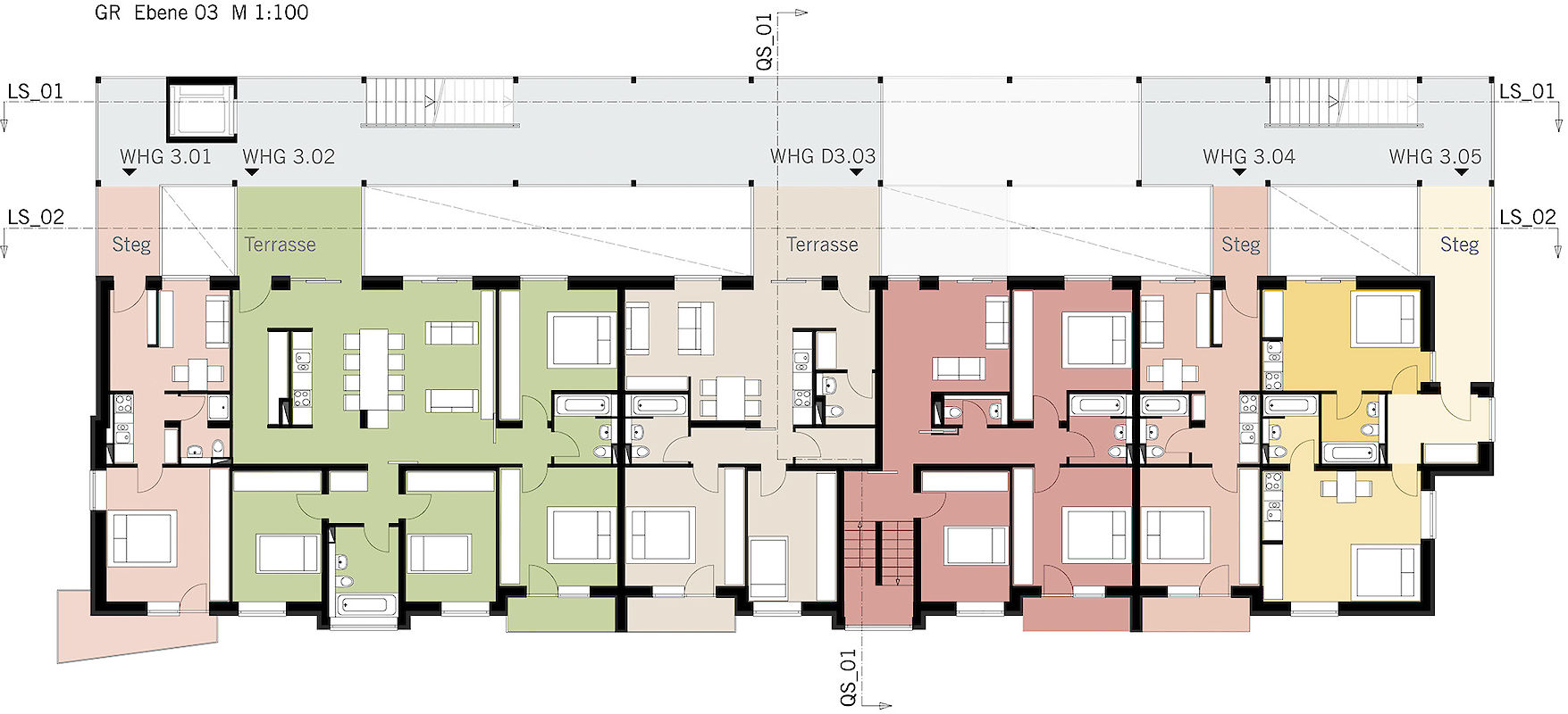 Durch das Extrahieren und Verlagern der Treppenhauserschließungen eröffnet sich Potential zur Grundrissneuordnung und es werden in den Obergeschossen zusätzlich wertvolle Wohnflächen für bis zu 26 barrierefreie Wohnungen gewonnen, davon 19 Whg. direkt mit dem Aufzug erschlossen. Eine typologische Vielfalt an nutzungsoffenen Wohnungszuschnitten ermöglichen Single-Wohnen, über Familienwohnen bis hin zu Mehrgenerationen-Wohnen und auch betreutem Wohnen. Privatheit und Rückzug sind ebenso möglich wie gemeinsame Alten- und Kinderbetreuung, bis hin zu Gemeinschaftlichkeit und Feiern. Auf dem Regal-Modul erhalten alle Wohnungen auch hinsichtlich der Himmelsrichtung gut nutzbare Außenwohnbereiche und das Regal-Modul bietet zu den verschiedenen Jahreszeiten jeweils Verschattung oder weiten Lichteinfall.