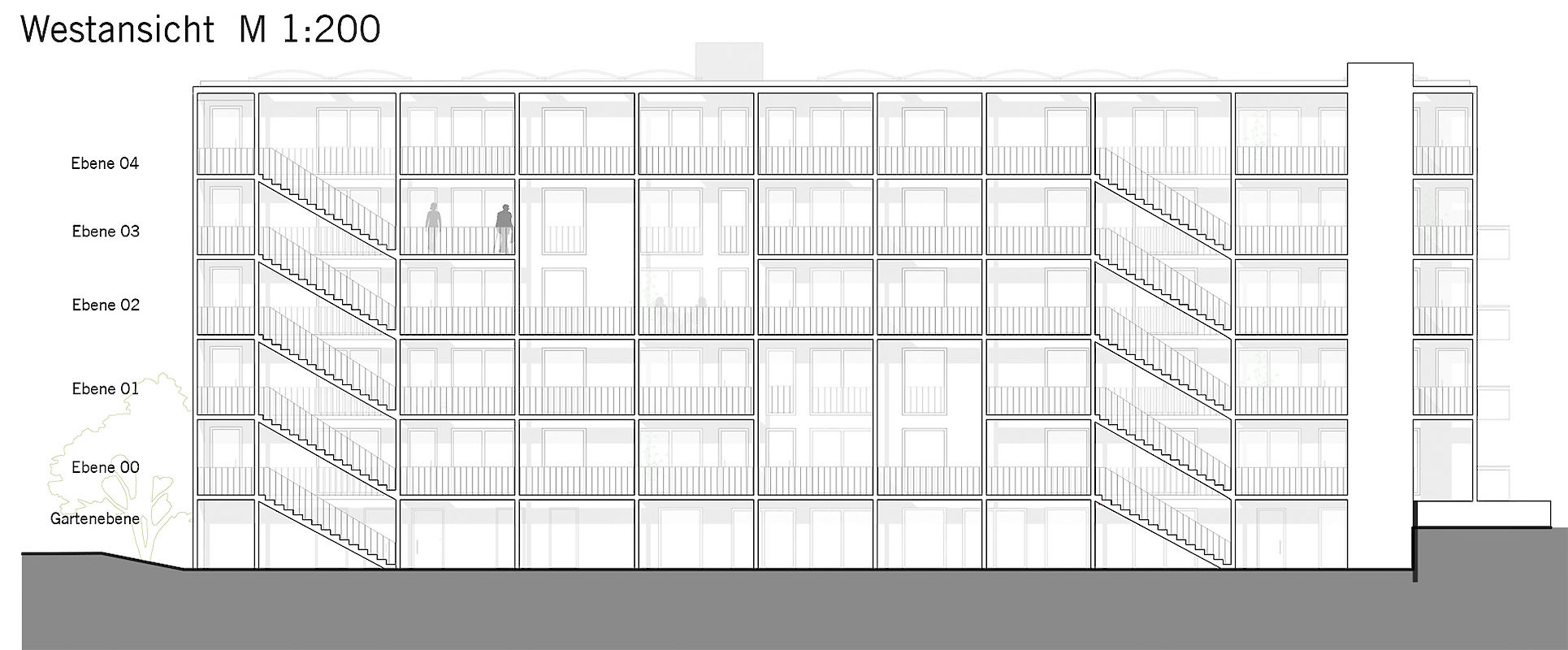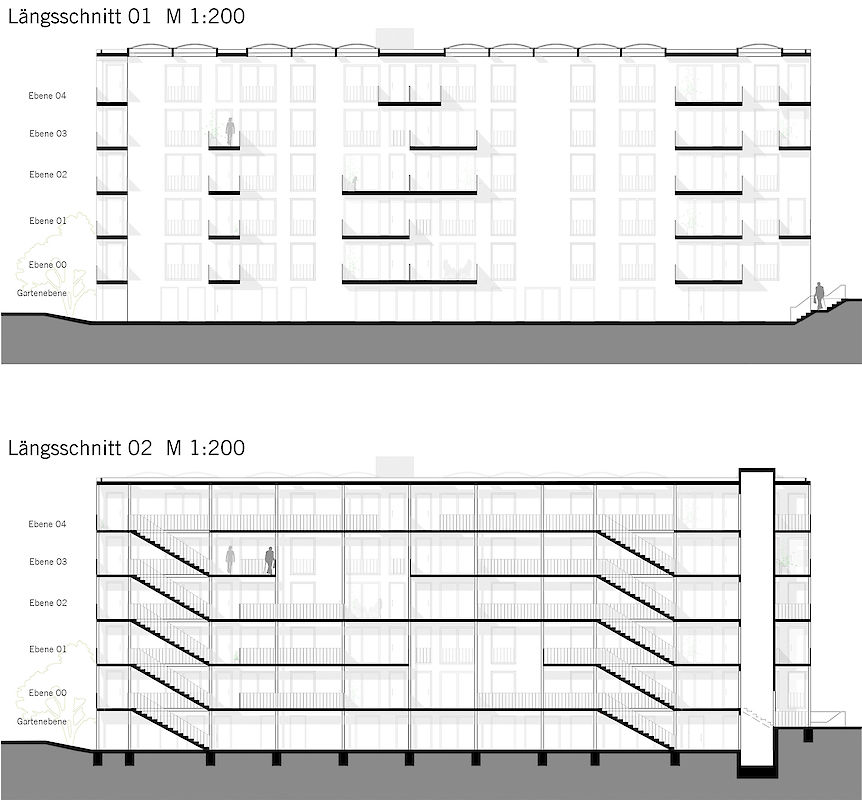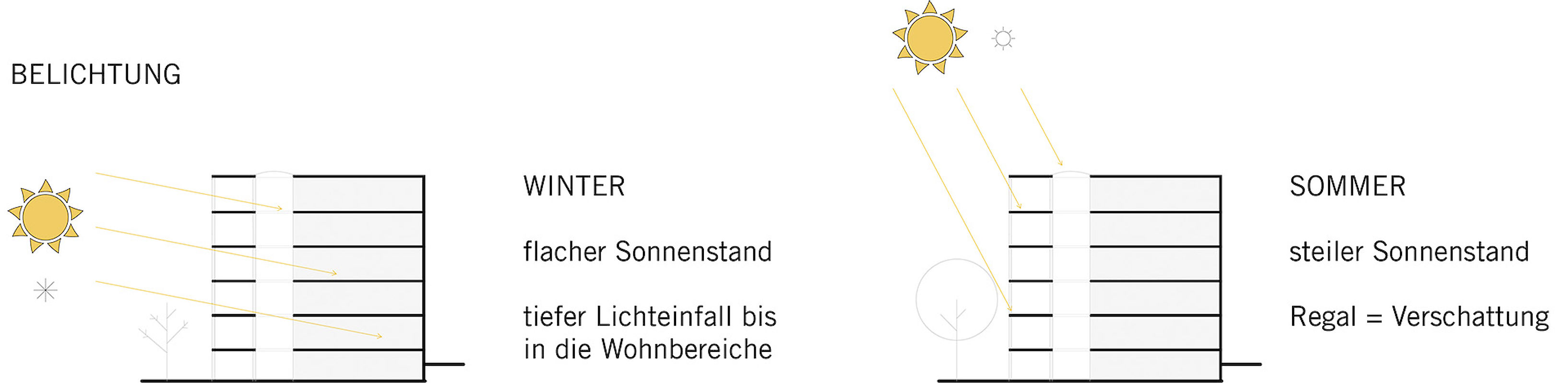 Es wird prototypisch vorgeschlagen einen Wohnblock mit einem Regal-Modul zu flankieren, welches nicht nur die Funktionsweise aller Erschließungen sicherstellt, sondern diese mit großer Aufenthaltsqualität und daher sozialer Qualität in öffentliche, halböffentliche und private Bereiche bis hin zu Wohnraumerweiterungen differenziert. Im Regal-Modul sind alle Eingangsbereiche mit Nebennutzungen als Ankunfts- und Kommunikationsorte differenziert gestaltet bis hin zu den Fahrradabstellflächen auf der Eingangsebene. Sowohl das Regal-Modul als auch die Garten- geschossebene bergen hybrid nutzbares Flächenpotential und stimulieren Sharing-Kultur in bester „Weniger ist Mehr“- Philosophie: Ein Aufzug für alle, sämtliche Wohnungen mit Terrassenanteil und Gartenzugang über das Regal-Modul. Auf der Gartenebene liegen multifunktionale Gemeinschafts- räume für Co-Working, Kinderbetreuung, Sport, Gästezimmer, etc. und gemeinschaftlich nutzbare Flächen wie Waschküche und Fahrradparken.