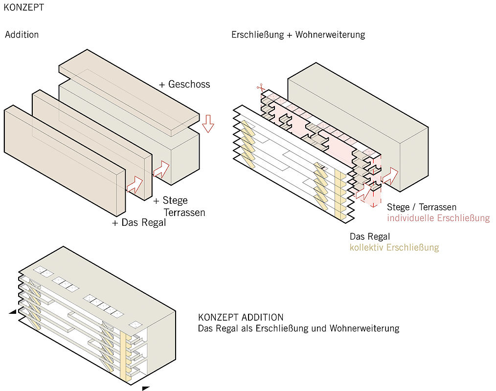 Das ungedämmte Regal-Modul stellt als veredelter Rohbau aus Sichtbeton-Fertigteilelementen sehr kostengünstig nicht nur die komplette Erschließung dar, sondern auch die terrassenartigen Wohn- raumerweiterungen. Durch das Extrahieren der Treppenhauserschließungen wird im gedämmten Gebäudevolumen Wohnraum geschaffen und durch das Dachgeschoss ebenso. Insgesamt werden durch die energetische Nutzungstrennung - Erschließung im ungedämmten Regal-Modul und Wohnraum im gedämmten Kern - die Investitions- und Folgekosten optimiert.