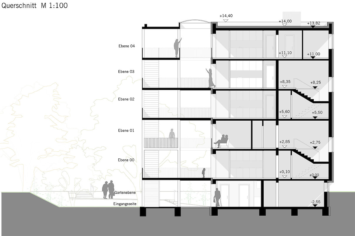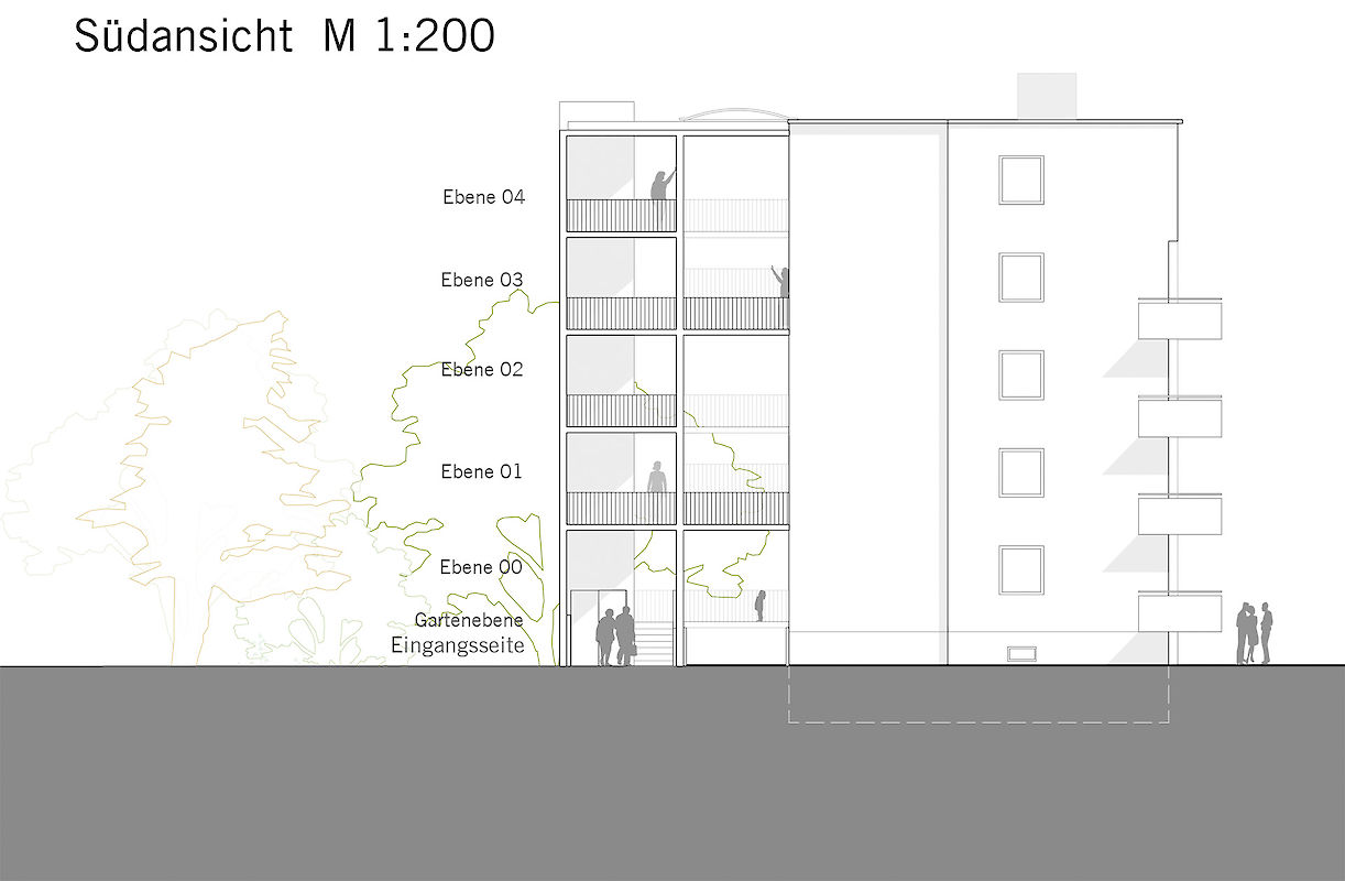 - Bereich wie Fahrradabstellflächen, Erschließung etc. werden nach Außen verlagert, es ergibt sich mehr Wohnraum im gedämmten Kern;