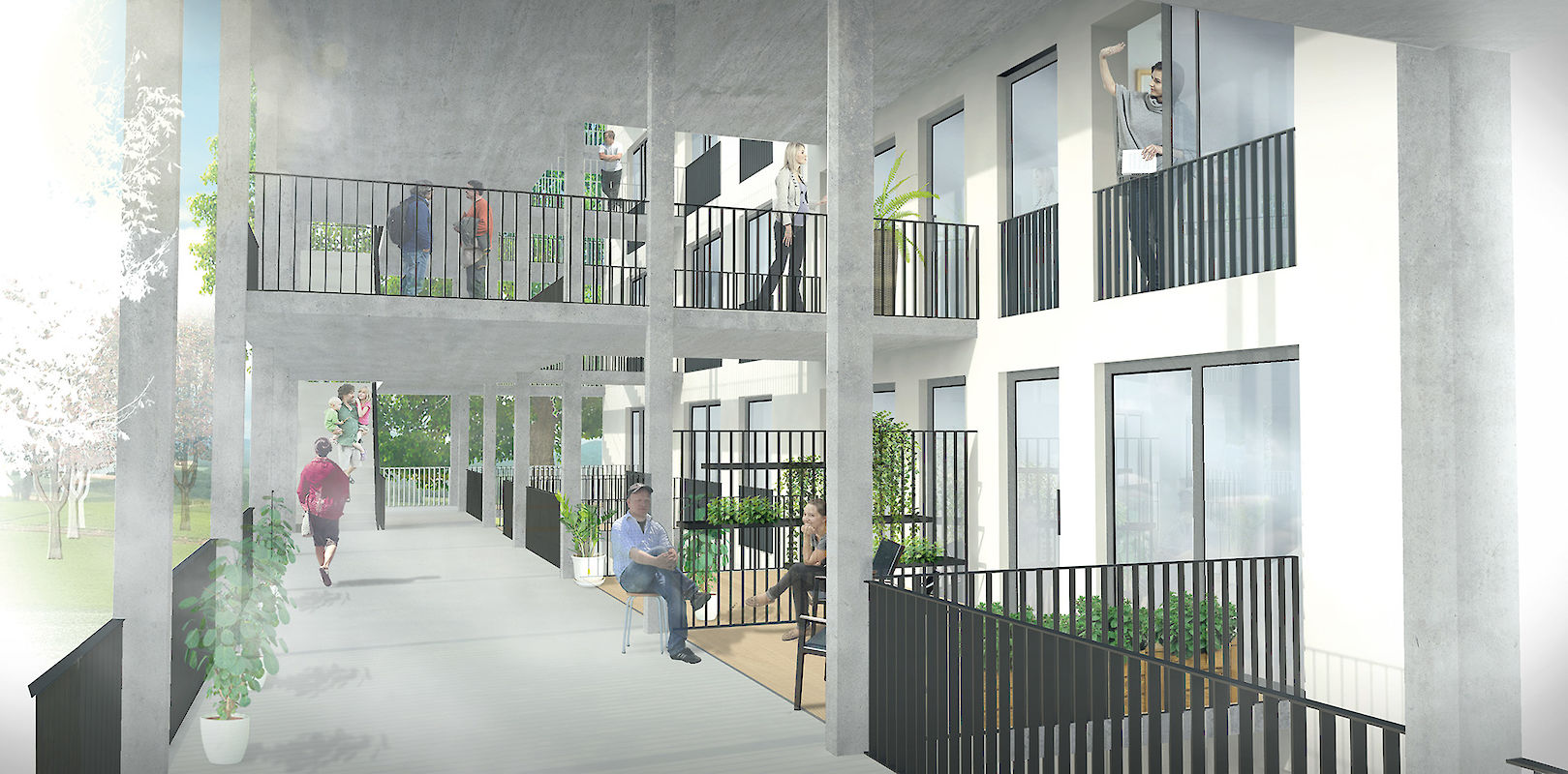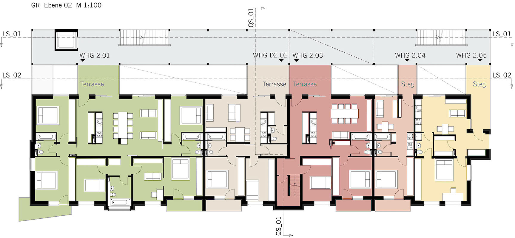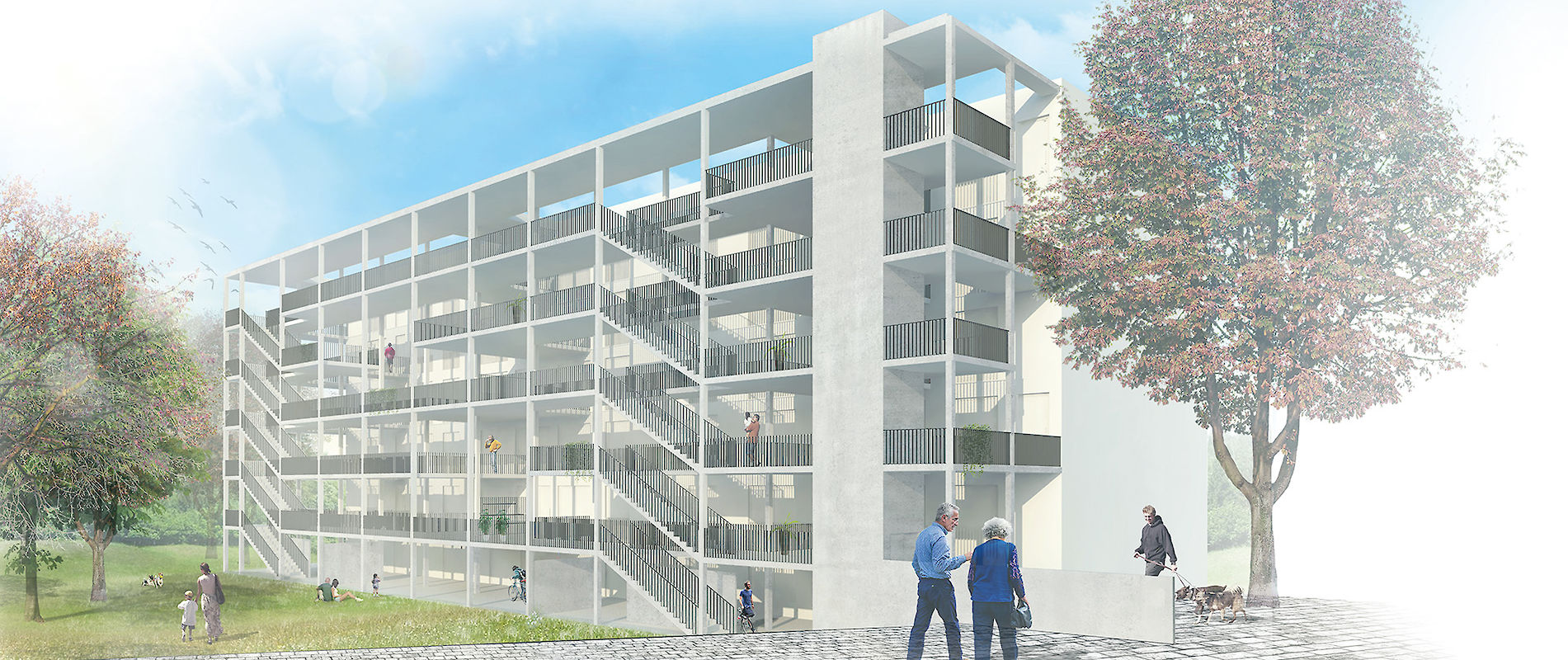 Durch das Extrahieren und Verlagern der Treppenhauserschließungen eröffnet sich Potential zur Grundrissneuordnung und es werden in den Obergeschossen zusätzlich wertvolle Wohnflächen für bis zu 26 barrierefreie Wohnungen gewonnen, davon 19 Whg. direkt mit dem Aufzug erschlossen. Eine typologische Vielfalt an nutzungsoffenen Wohnungszuschnitten ermöglichen Single-Wohnen, über Familienwohnen bis hin zu Mehrgenerationen-Wohnen und auch betreutem Wohnen. Privatheit und Rückzug sind ebenso möglich wie gemeinsame Alten- und Kinderbetreuung, bis hin zu Gemeinschaftlichkeit und Feiern. Auf dem Regal-Modul erhalten alle Wohnungen auch hinsichtlich der Himmelsrichtung gut nutzbare Außenwohnbereiche und das Regal-Modul bietet zu den verschiedenen Jahreszeiten jeweils Verschattung oder weiten Lichteinfall.