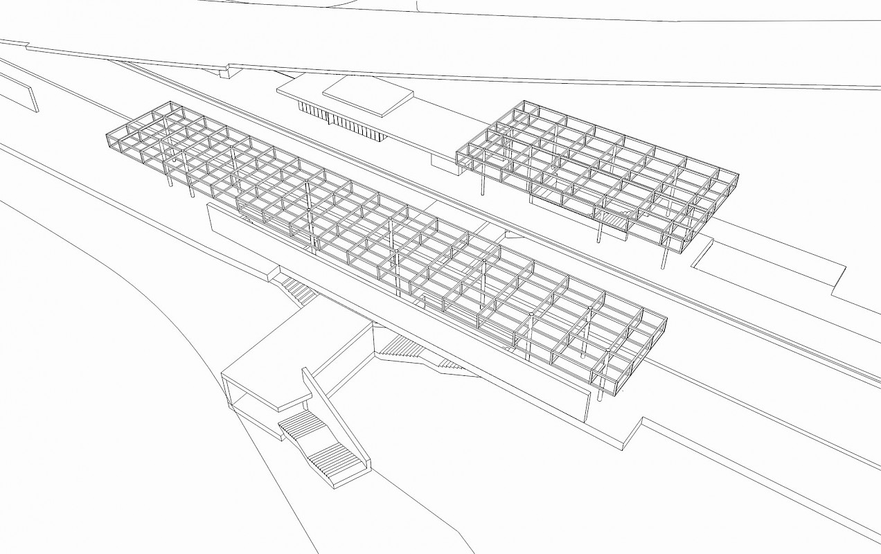 The station roof is a combination of a primary structure of steel beams resting on irregularly placed columns. The irregularity of these columns allows for access by stairs to a pedestrian tunnel while also providing a free space at the nodal points of pedestrian traffic.