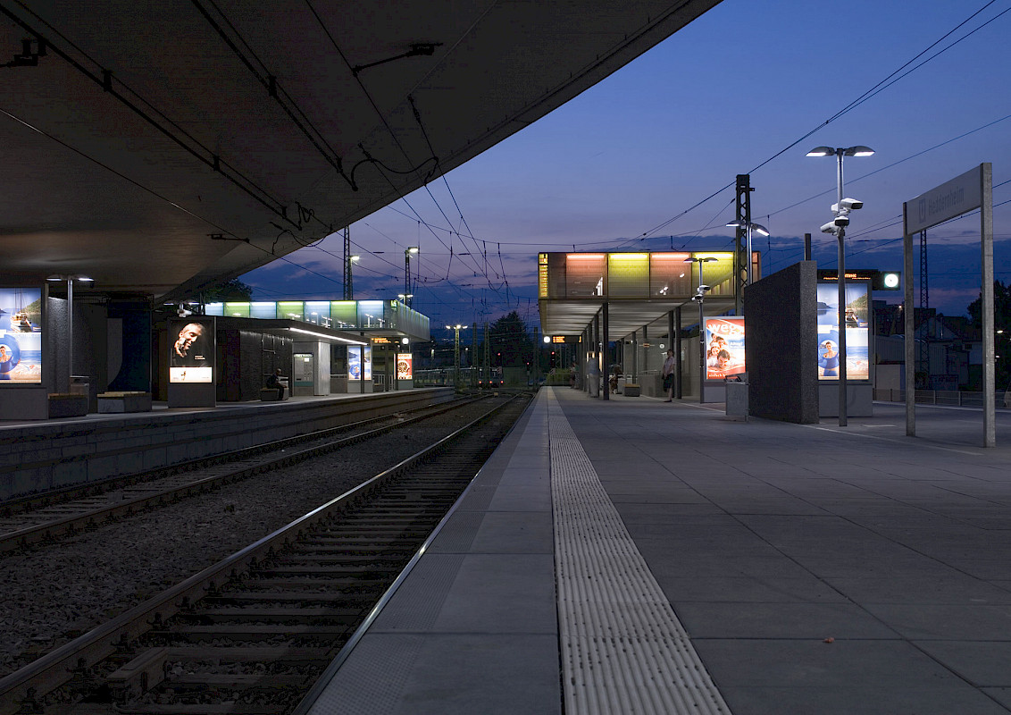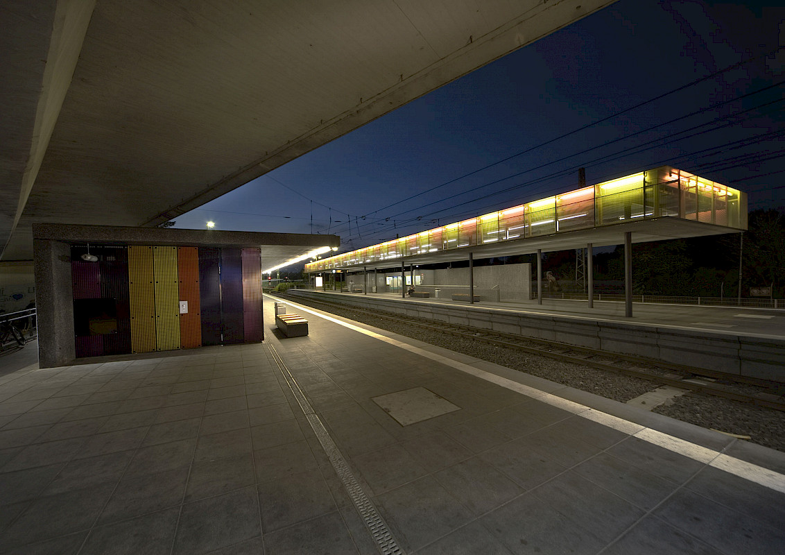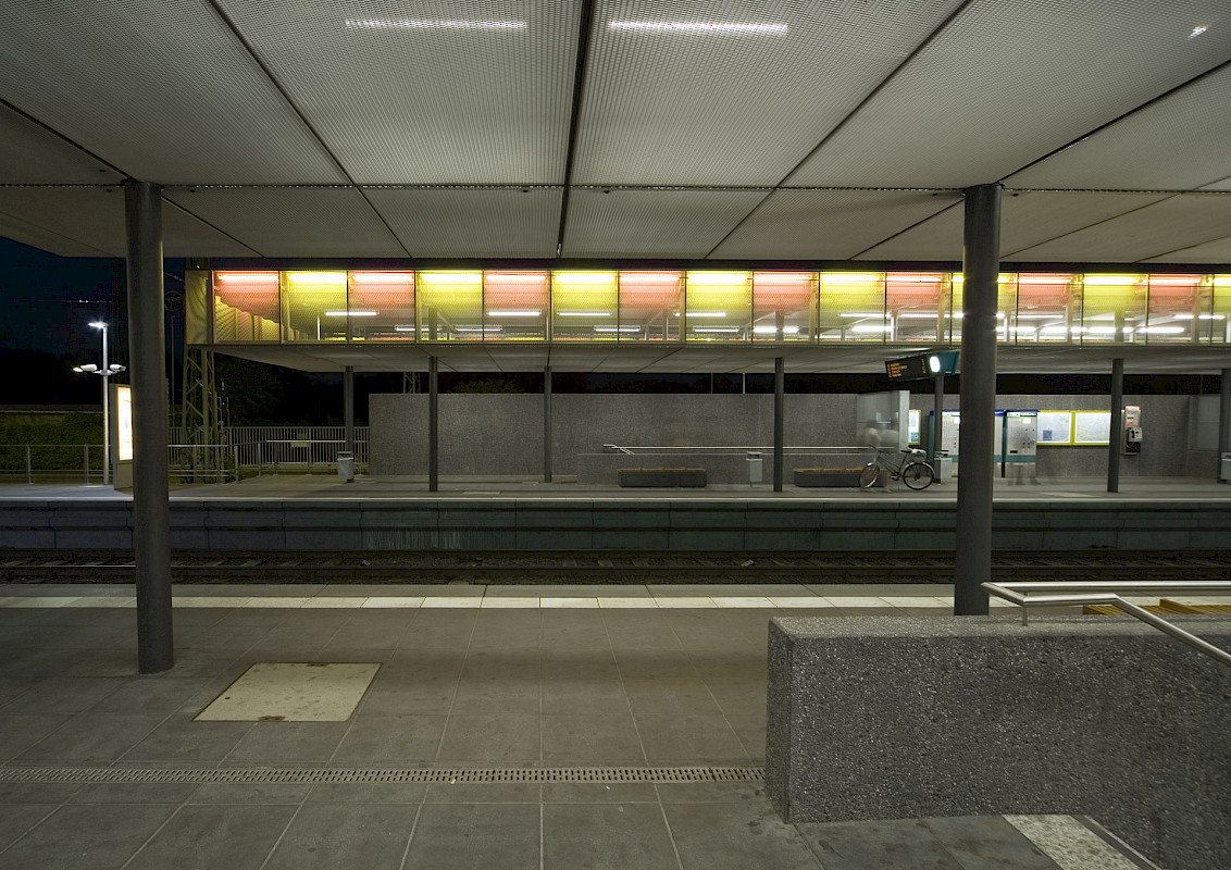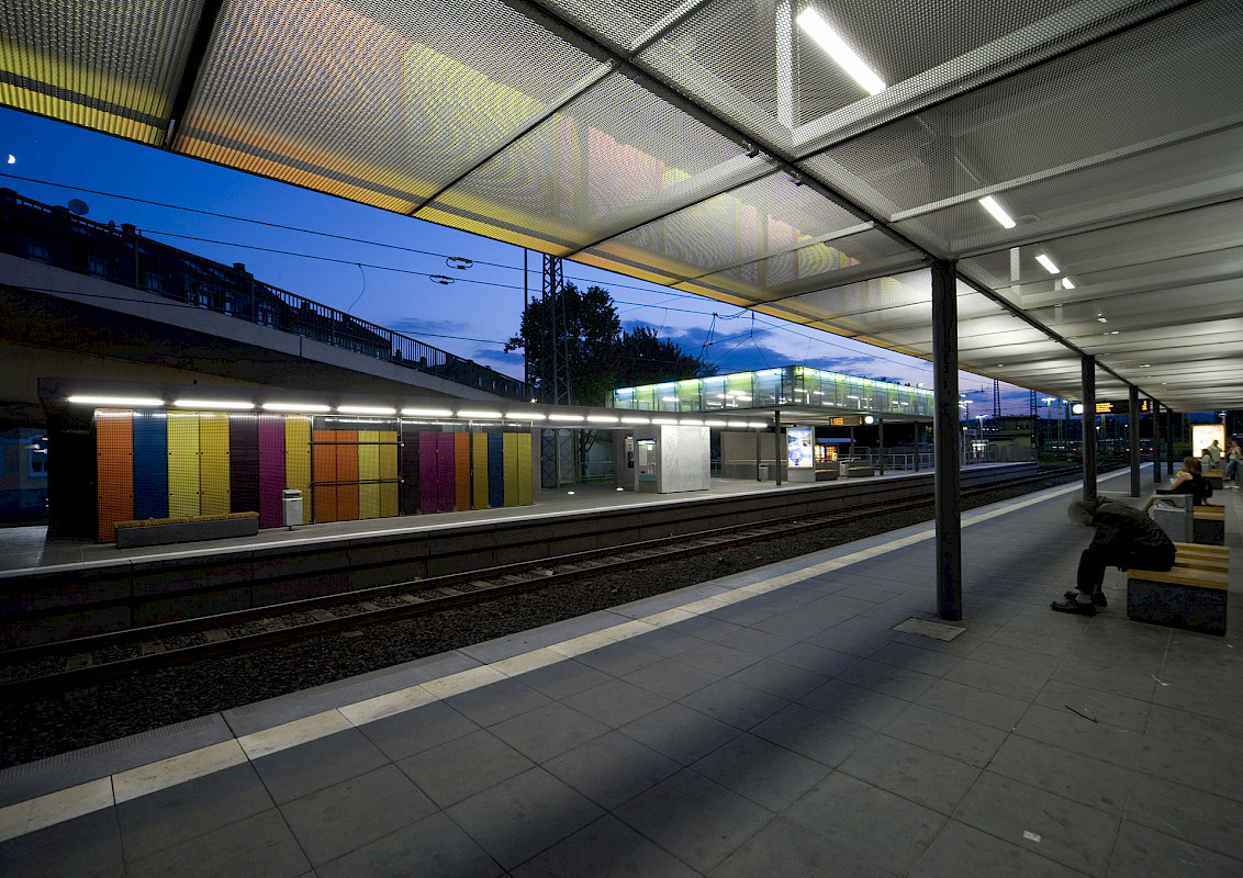 On the city bound platform a new fully glazed kiosk with the character of a small shop has been built. This glass cube is protected at night with metal mash panels behind which are coloured metal offering additional protection and once again paying homage to the colour pallet of Donald Judd. The kiosk has a large cantilevered concrete roof, which provides a dry area between the platform and the Maybach Bridge. The main concrete wall of the kiosk is executed in black exposed concrete that surface has a hammer finish.