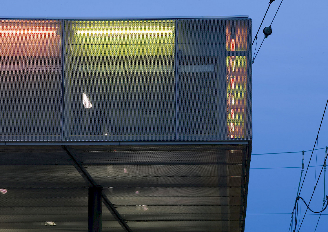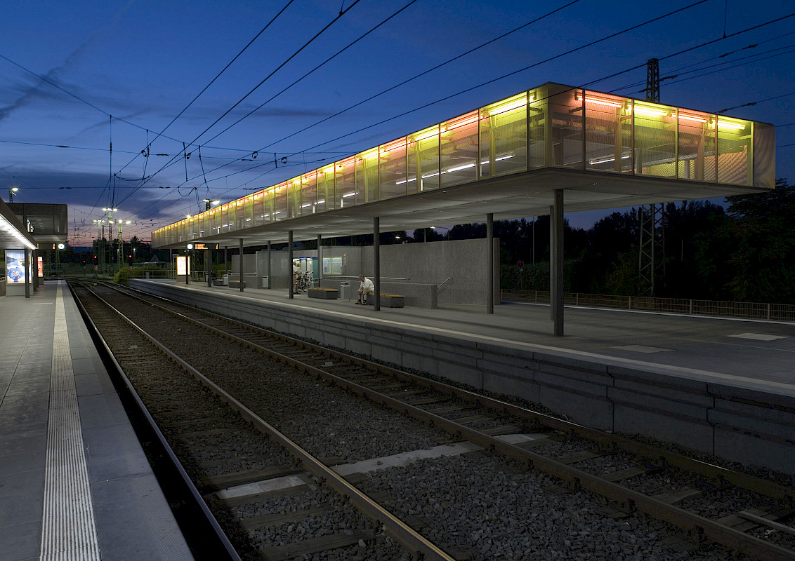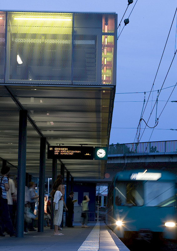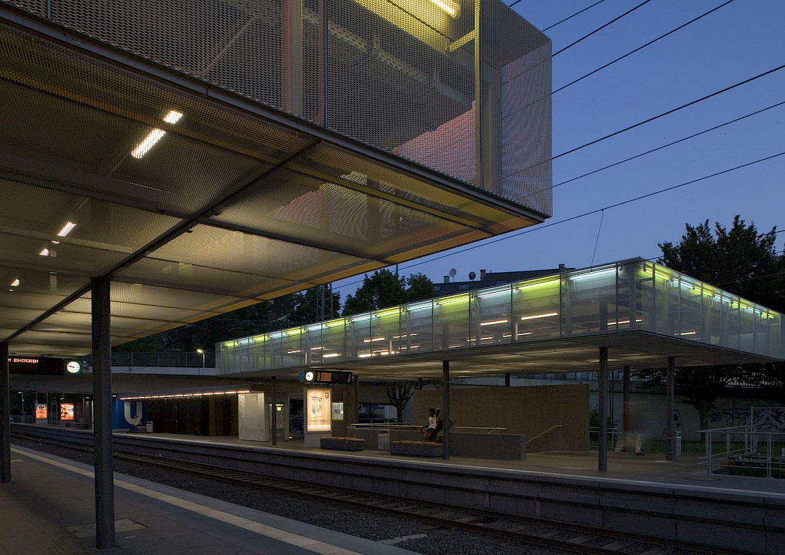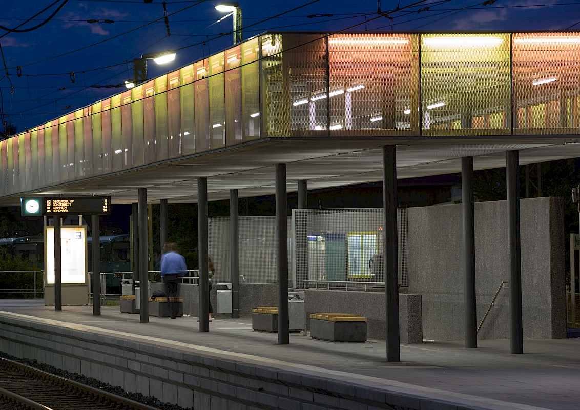 The Jury was impressed by the confident design of this subway station of which large sections are above ground. The lightness of the roofs over the platforms derives not from the refined nature of the structure but from the fact that their solid volumes dissolve in a sense of light and transparency (expanded mesh). Consequently, they have more the appearence of an additional level than of a platform roofing. This effect, together with the dynamic alternation of the light colours (the trains entering and leaving the station bathe the railway in changing light) lends the underground station high-profile significance as part of the urban landscape. Seldom is highly quality architecture to be found in such transportrelated buildings, but in this instance we have a highly successful and fascinating synthesis of design, material and light.