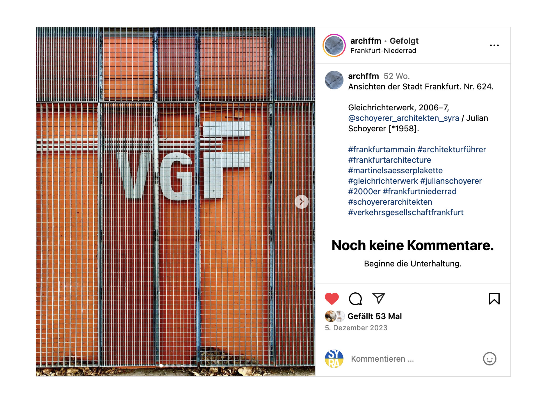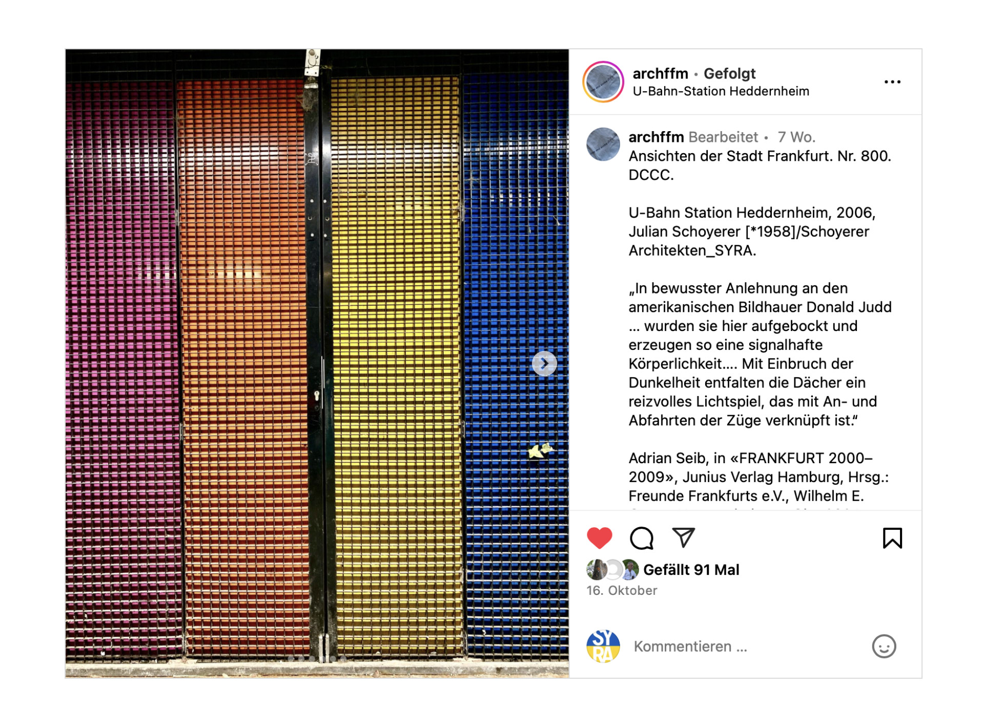| 2024 | SYRA im Architekturführer Frankfurt 2000 - 2009 mit 2 Projekten, auch bei Instagram | Gleichrichterwerk Rennbahnstraße U-Bahnstation Heddernheim U-Bahnstation Heddernheim | INSTAGRAM.COM |