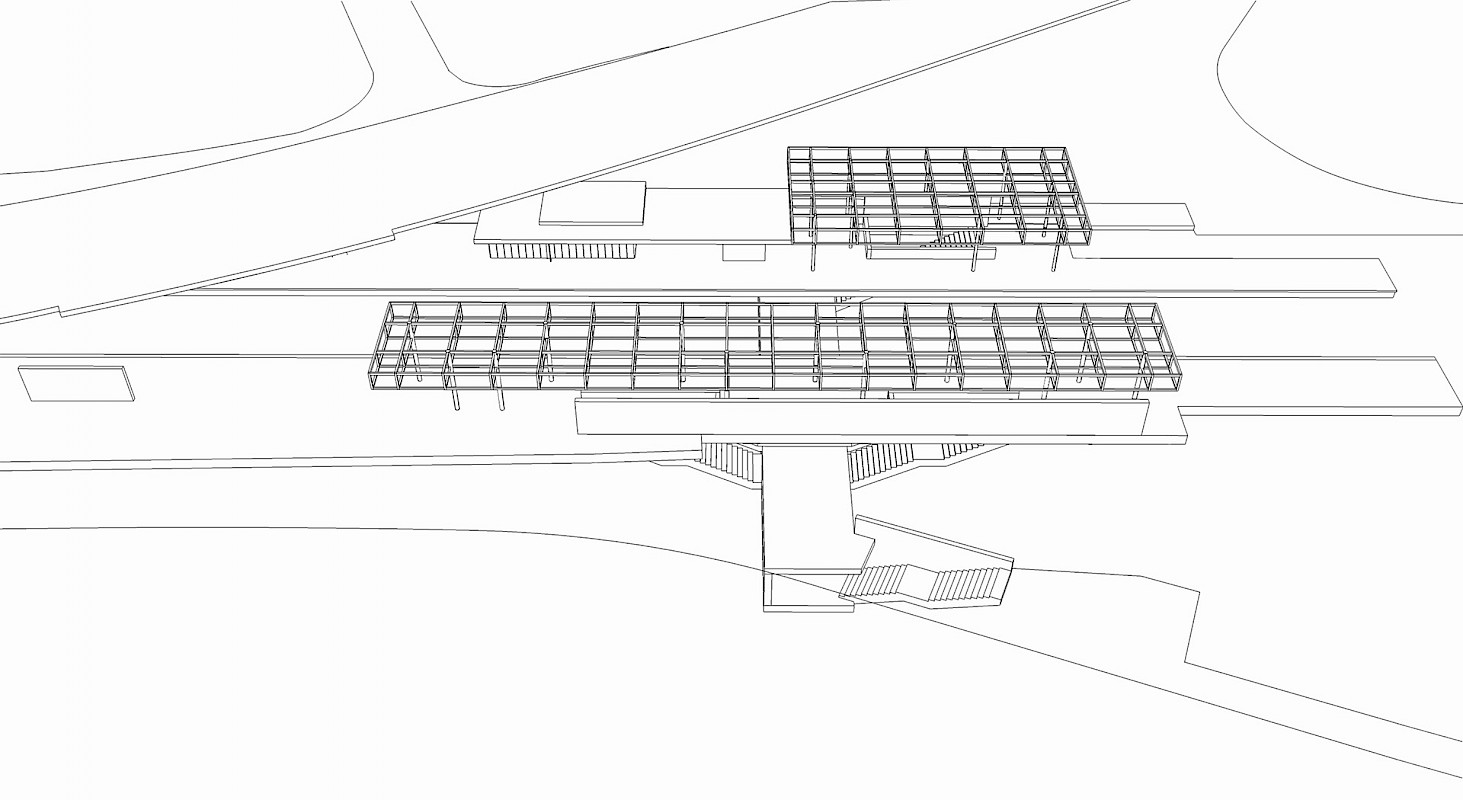 The station roof is a combination of a primary structure of steel beams resting on irregularly placed columns. The irregularity of these columns allows for access by stairs to a pedestrian tunnel while also providing a free space at the nodal points of pedestrian traffic.