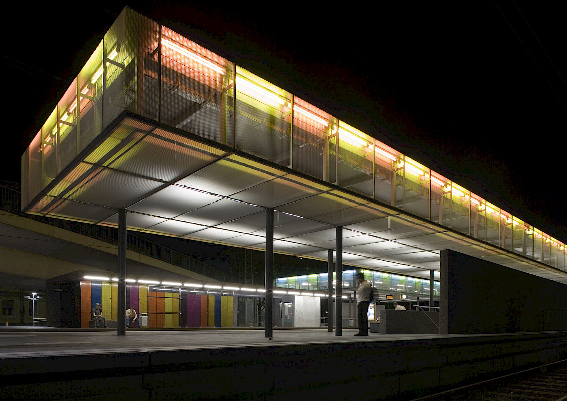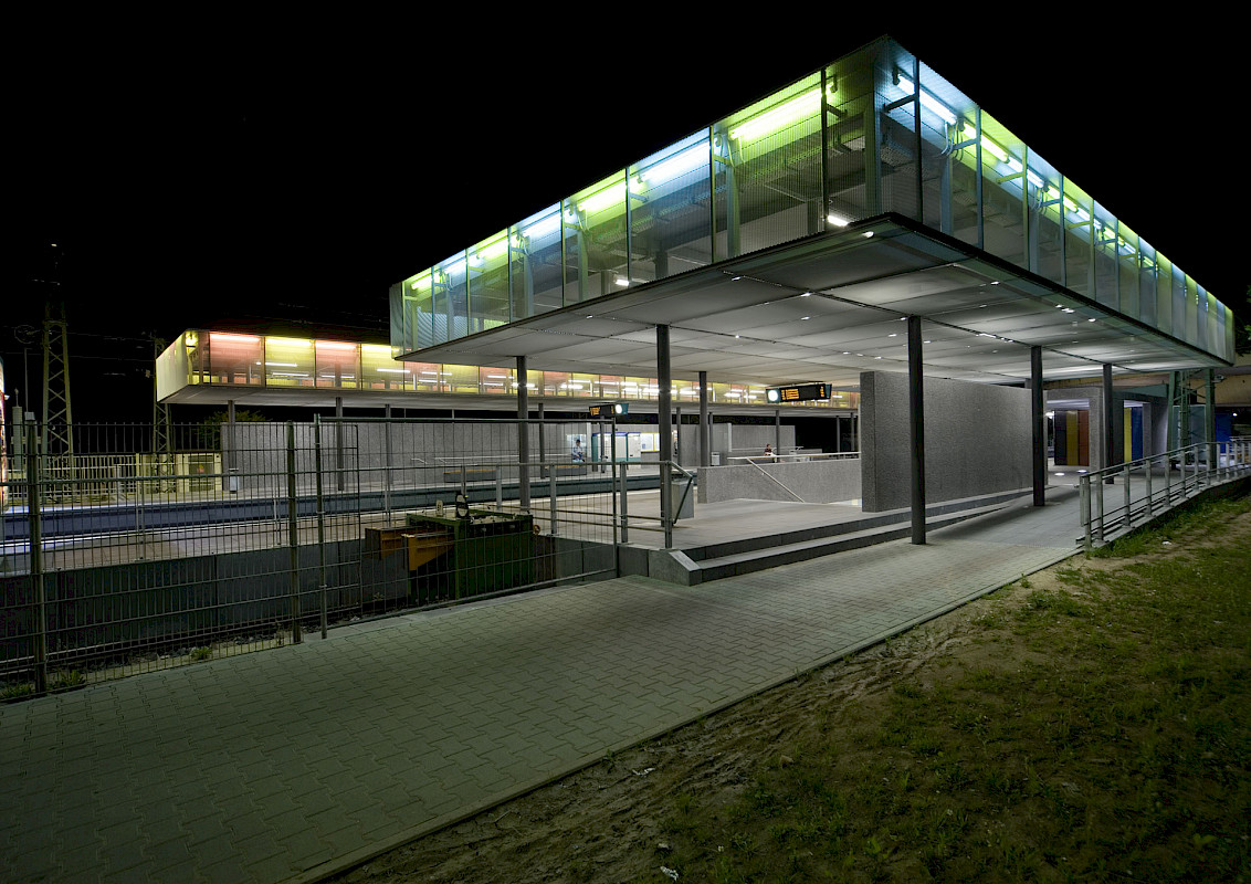 The Jury was impressed by the confident design of this subway station of which large sections are above ground. The lightness of the roofs over the platforms derives not from the refined nature of the structure but from the fact that their solid volumes dissolve in a sense of light and transparency (expanded mesh). Consequently, they have more the appearence of an additional level than of a platform roofing. This effect, together with the dynamic alternation of the light colours (the trains entering and leaving the station bathe the railway in changing light) lends the underground station high-profile significance as part of the urban landscape. Seldom is highly quality architecture to be found in such transportrelated buildings, but in this instance we have a highly successful and fascinating synthesis of design, material and light.