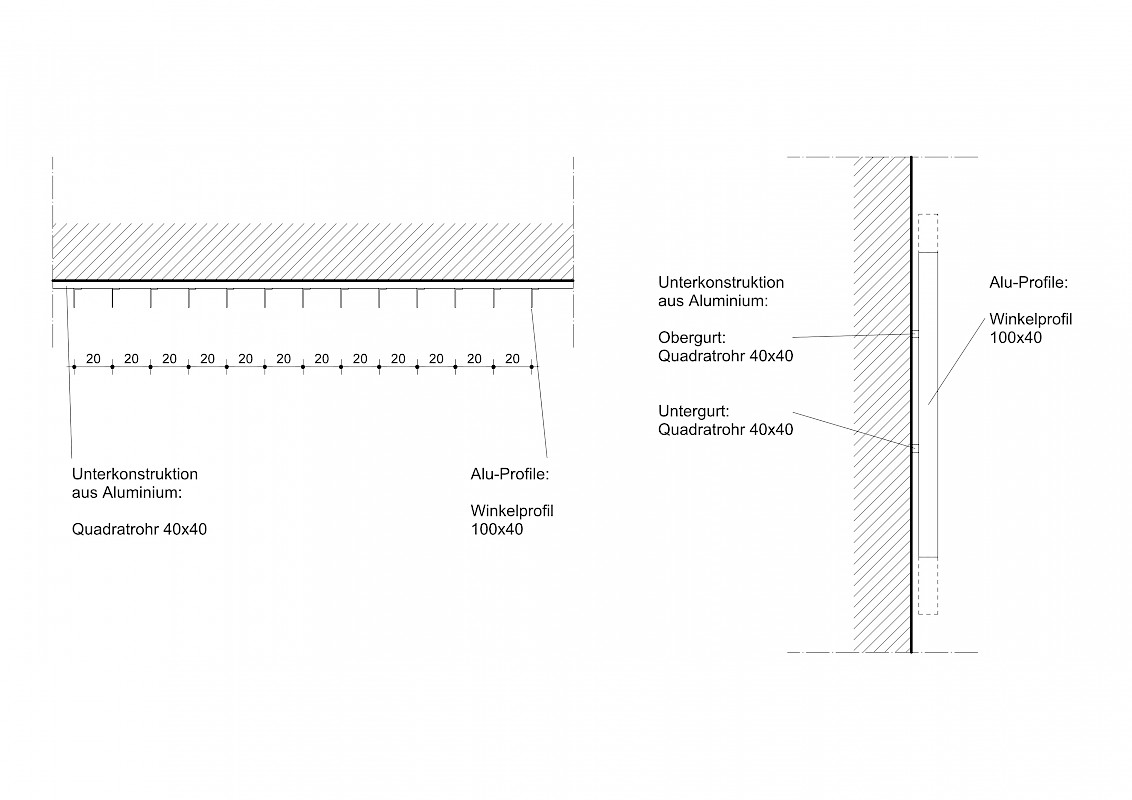 Es wird eine Installation aus vertikalen Alu-L-Winkeln (100/40 mm, d= 4mm) im Abstand von ca. 200 mm vorgeschlagen. Ober- und Unterkante der Alu-Winkel variieren im Wegeverlauf sodass die Kontur der Installation als große wellenförmige Bewegung wahrgenommen werden kann. Die Alu-L-Winkel sind über eine simple Unterkonstruktion aus Alu-Quadratprofilen (40 x x40 mm, d= 4mm) an den Seitenwänden aufgebracht.