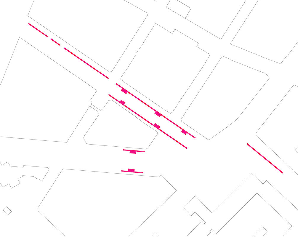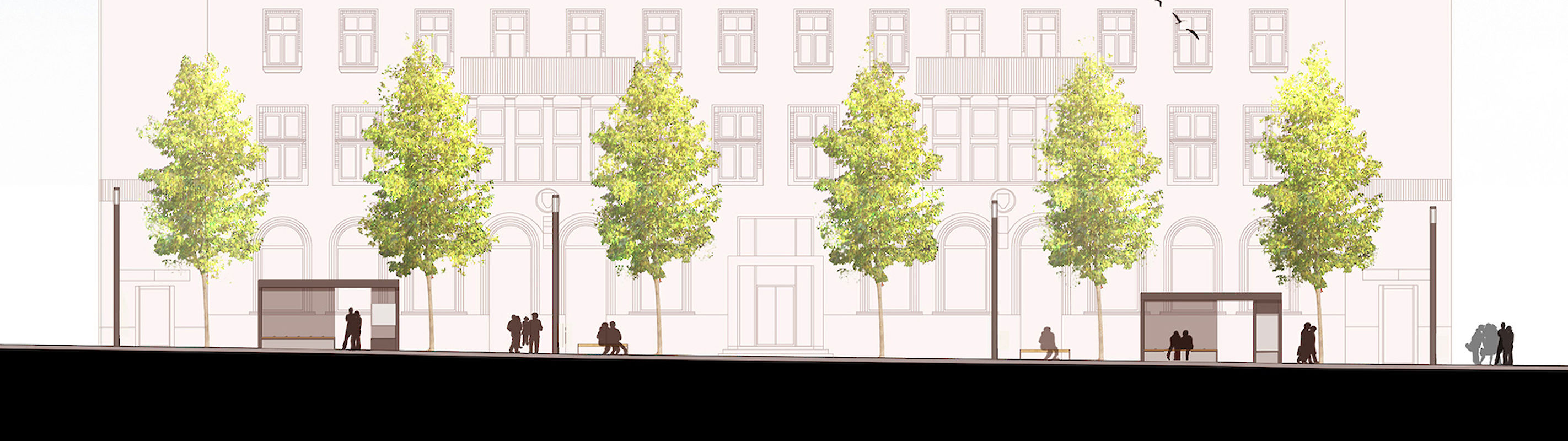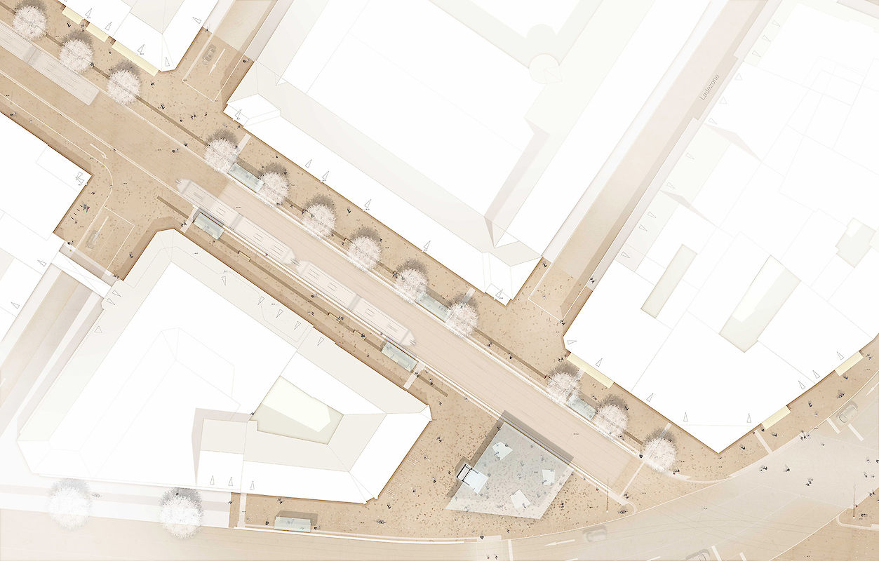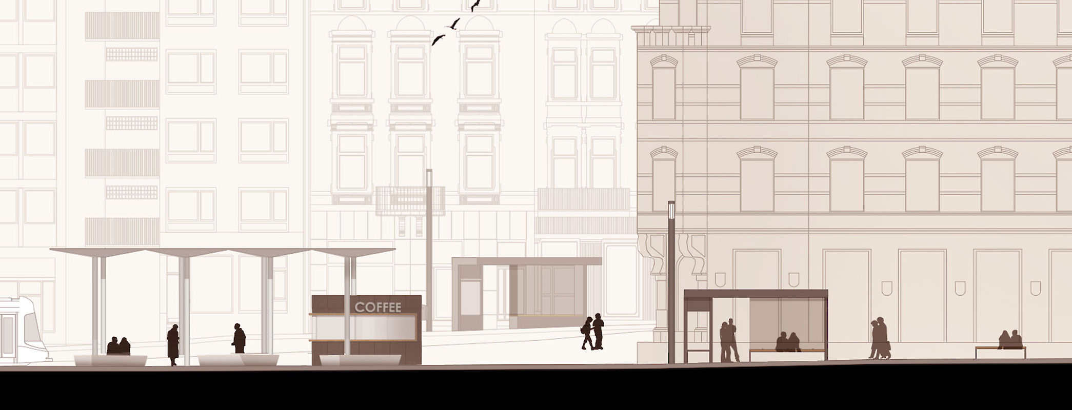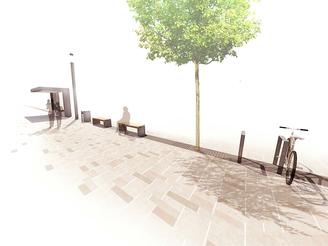 Die Bereiche Münsterplatz - Bahnhofstraße - Binger Straße unterscheiden sich funktional und stadträumlich – daher schlagen wir hier jeweils spezifische Architekturelemente vor. Für die Bahnhofstraße und die Binger Straße werden Wartehallen mit klarer und einfacher Formensprache vorgesehen, welche sich in die Umgebung integrieren, ohne diese zu dominieren. Am Münsterplatz wird vor der Ostfassade des Sparkassengebäudes eine großzügige und markante Überdachung vorgeschlagen deren hoher Wiedererkennungswert dem Ort eine neue Adresse verleiht. Zudem bietet in diesem Bereich ein kleiner Kiosk praktische Einkaufsmöglichkeiten. Trotz der komplexen Verkehrssituation entsteht hier ein stadträumlich attraktiver Bereich mit hoher Aufenthaltsqualität.