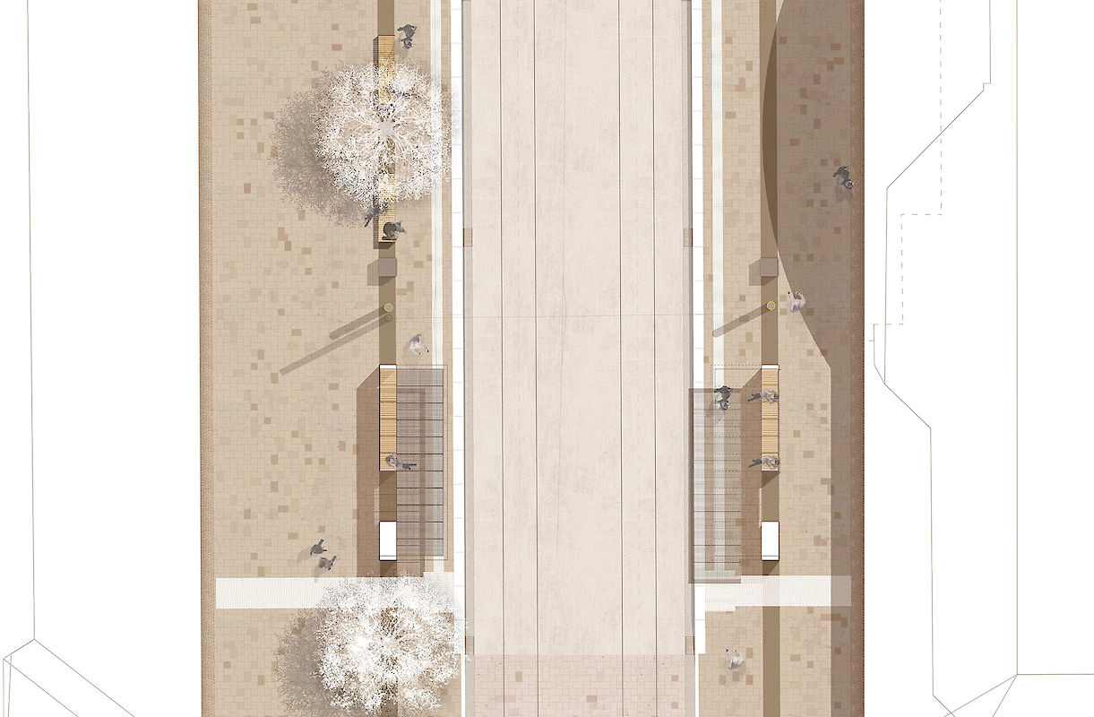 Der Münsterplatz gliedert sich in zwei unterschiedliche Abschnitte mit unterschiedlichen Nutzungen auf beiden Seiten der asphaltierten Hauptverkehrslinie. Während die westliche Seite als Zentrum der Premiumhaltestelle den funktionalen Anforderungen entsprechend ausgestattet wird, wird der östliche Teil des Platzes unter den frei angeordneten Gleditsien (Gleditsia triacanthos `Sunburst`) weitestgehend freigehalten um Gastronomie, temporären Einrichtungen und Veranstaltungen Raum zu geben.