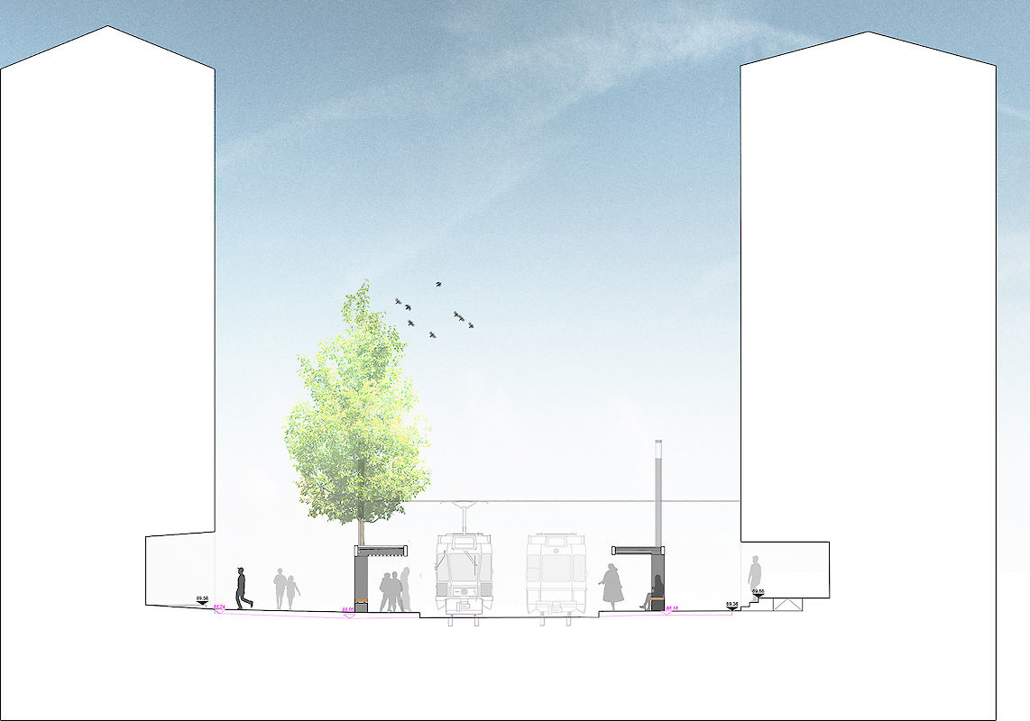 Die Bereiche Münsterplatz - Bahnhofstraße - Binger Straße unterscheiden sich funktional und stadträumlich – daher schlagen wir hier jeweils spezifische Architekturelemente vor. Für die Bahnhofstraße und die Binger Straße werden Wartehallen mit klarer und einfacher Formensprache vorgesehen, welche sich in die Umgebung integrieren, ohne diese zu dominieren. Am Münsterplatz wird vor der Ostfassade des Sparkassengebäudes eine großzügige und markante Überdachung vorgeschlagen deren hoher Wiedererkennungswert dem Ort eine neue Adresse verleiht. Zudem bietet in diesem Bereich ein kleiner Kiosk praktische Einkaufsmöglichkeiten. Trotz der komplexen Verkehrssituation entsteht hier ein stadträumlich attraktiver Bereich mit hoher Aufenthaltsqualität.