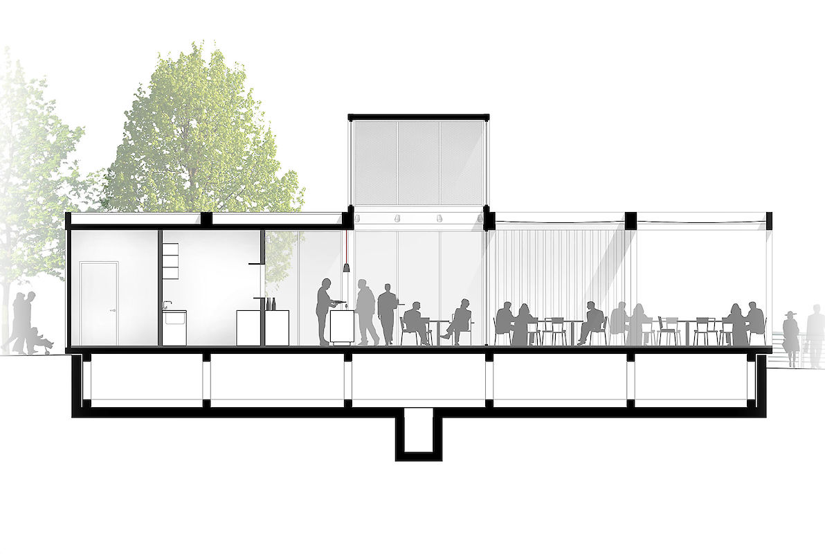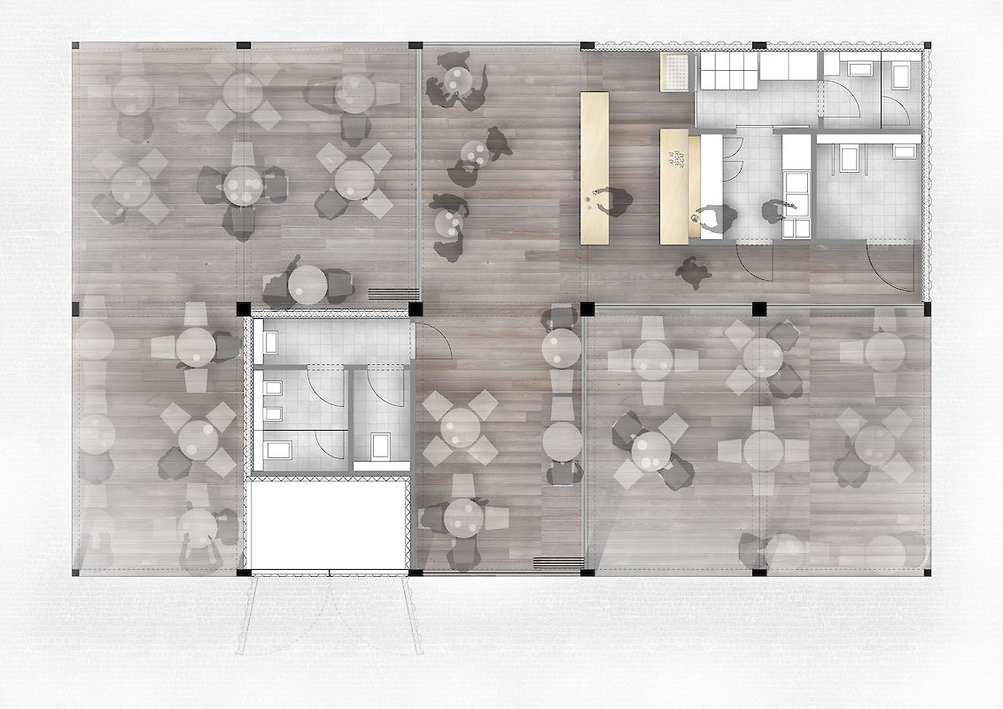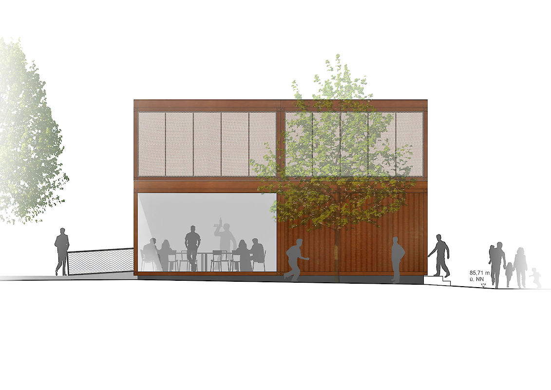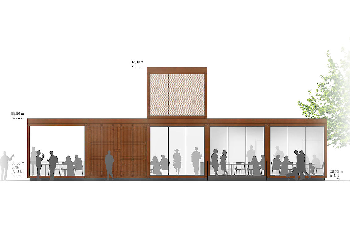 Die Doppelreihe von Schiffscontainern besteht aus einem Wechsel von geschlossenen und offenen Containern, je nach Ausrichtung entstehen so attraktive Außenbezüge für die Gästebereiche und gleichzeitig werden Gebäuderückseiten vermeiden. Die einzelnen Schiffscontainermodule bestehen aus Corten-Stahl Rahmen und Fassadenflächen. In den mit Trapezblech geschlossenen Containern sind die Servicebereiche (Küche, WCs (bei der Trafovariante austauschbar), etc.) untergebracht. Die Rahmenstruktur der offenen Container bildet den verglasten/abschließbaren Gastraum und die Pergolen der Terrassenbereiche zur Außenbewirtschaftung. Die Containerrahmen/Pergolen werden mit hellen PVC-LKW-Planen als Sonnenschutz ausgestattet. Die Flachdächer (Kunststoffbahnen) der geschlossenen Container werden oberflächenbündig mit Gitterrost abgedeckt (fünfte Fassade).