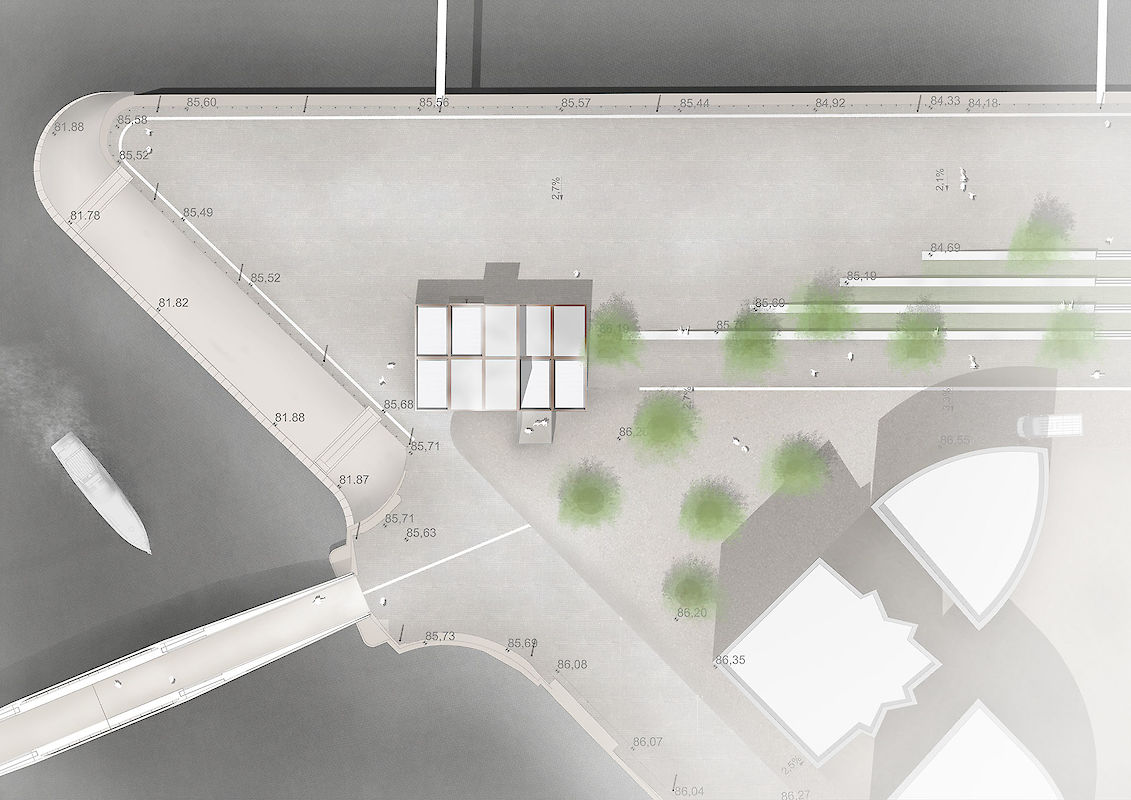 Die Verfasser schlagen einen Pavillon vor, der hinsichtlich Lage, Konfiguration, Ausrichtung und architektonischem Ausdruck schlüssig und allürenlos an das Thema Zollhafen erinnert. Im Bereich des Planungsgebietes ist das Bild von parallel zum Rhein gereihten und gestapelten Schiffscontainerburgen noch sehr gut in Erinnerung. Der Masterplan nimmt in der Gebäudeanordnung dieses Bild von den rund um das Hafenbecken angeordneten großen Volumen auf. Die Verfasser erinnern mit Ihrem Pavillonentwurf an der Spitze der Zollhafensüdmole an eine parallel zur Stromrichtung angeordnete Ladung von Schiffscontainern, als seien diese gerade von einem Schiff abgeladen worden oder als stünden sie zur Abholung bereit. Alleine dieses Bild von abgestellten Schiffscontainern vermittelt Assoziationen von Hafen, Reise, Ferne, Warenumschlag und Austausch. Der Pavillon wird kaum als Gebäude wahrnehmbar sein sondern als logische und selbsterklärende Landmark.