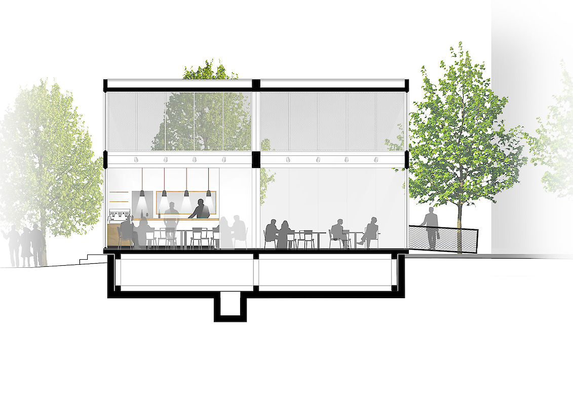 Die Doppelreihe von Schiffscontainern besteht aus einem Wechsel von geschlossenen und offenen Containern, je nach Ausrichtung entstehen so attraktive Außenbezüge für die Gästebereiche und gleichzeitig werden Gebäuderückseiten vermeiden. Die einzelnen Schiffscontainermodule bestehen aus Corten-Stahl Rahmen und Fassadenflächen. In den mit Trapezblech geschlossenen Containern sind die Servicebereiche (Küche, WCs (bei der Trafovariante austauschbar), etc.) untergebracht. Die Rahmenstruktur der offenen Container bildet den verglasten/abschließbaren Gastraum und die Pergolen der Terrassenbereiche zur Außenbewirtschaftung. Die Containerrahmen/Pergolen werden mit hellen PVC-LKW-Planen als Sonnenschutz ausgestattet. Die Flachdächer (Kunststoffbahnen) der geschlossenen Container werden oberflächenbündig mit Gitterrost abgedeckt (fünfte Fassade).