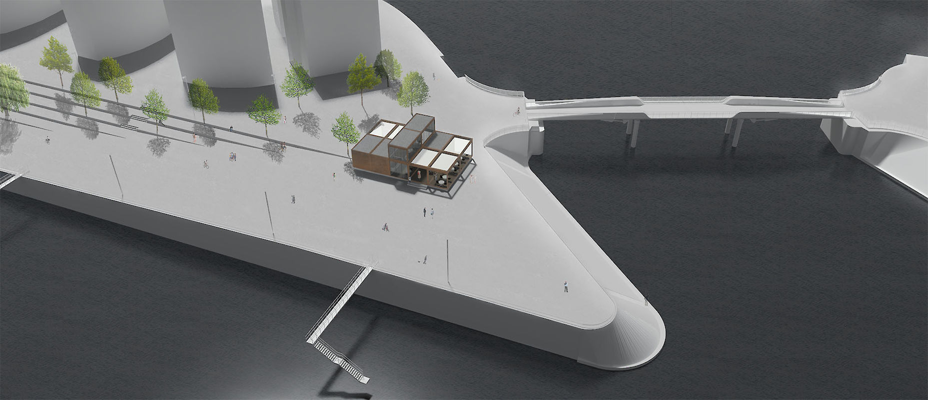 Die Verfasser schlagen einen Pavillon vor, der hinsichtlich Lage, Konfiguration, Ausrichtung und architektonischem Ausdruck schlüssig und allürenlos an das Thema Zollhafen erinnert. Im Bereich des Planungsgebietes ist das Bild von parallel zum Rhein gereihten und gestapelten Schiffscontainerburgen noch sehr gut in Erinnerung. Der Masterplan nimmt in der Gebäudeanordnung dieses Bild von den rund um das Hafenbecken angeordneten großen Volumen auf. Die Verfasser erinnern mit Ihrem Pavillonentwurf an der Spitze der Zollhafensüdmole an eine parallel zur Stromrichtung angeordnete Ladung von Schiffscontainern, als seien diese gerade von einem Schiff abgeladen worden oder als stünden sie zur Abholung bereit. Alleine dieses Bild von abgestellten Schiffscontainern vermittelt Assoziationen von Hafen, Reise, Ferne, Warenumschlag und Austausch. Der Pavillon wird kaum als Gebäude wahrnehmbar sein sondern als logische und selbsterklärende Landmark.