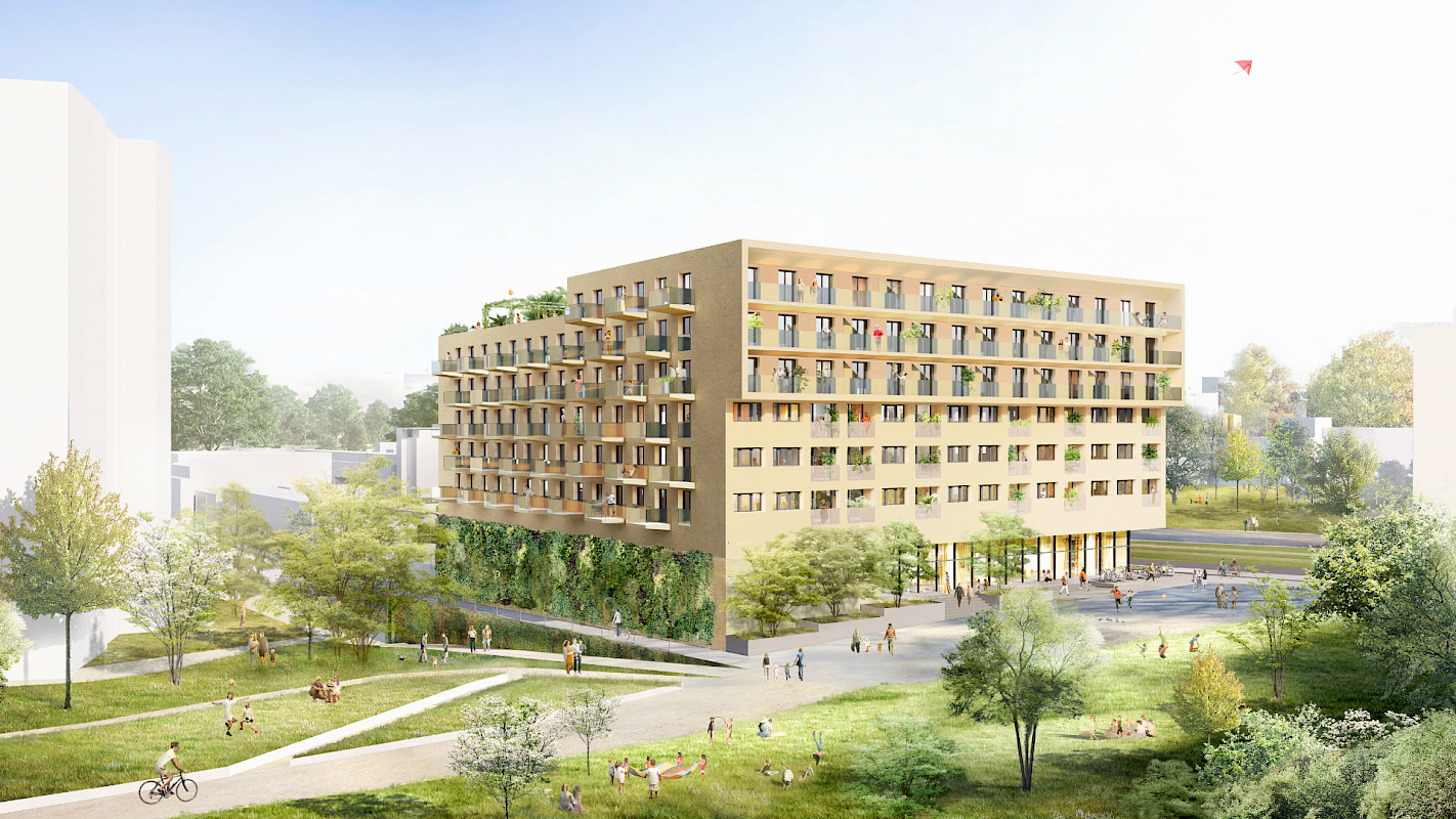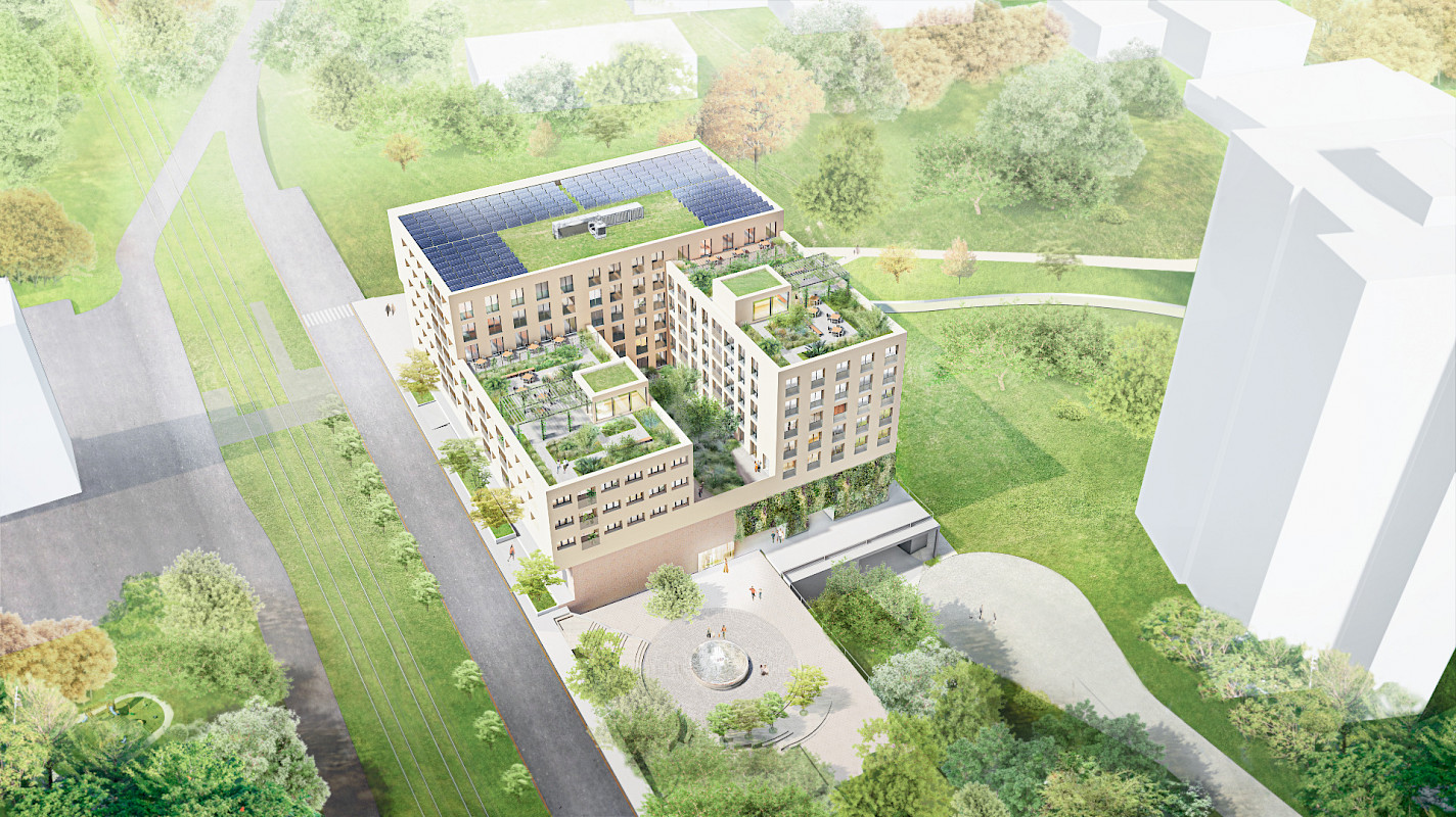 Links liegt das höchste Bauvolumen mit sechs Wohngeschossen und einer extensiven Dachbegrünung plus PV-Anlage.