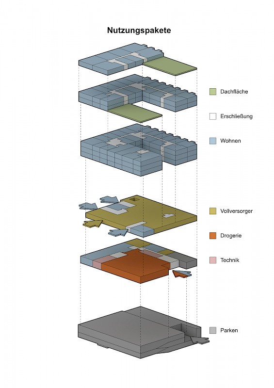 Oberhalb der Gewerbeeinheiten liegt rechts das niedrigste Bauvolumen mit drei Wohngeschossen und nutzbarer intensiv begrünter Dachterrasse.