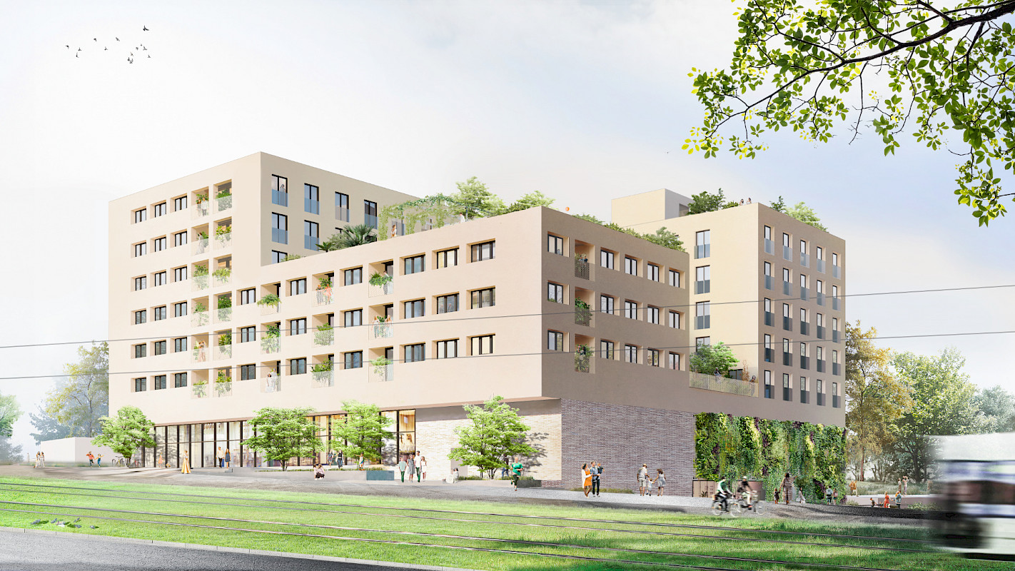 Links liegt das höchste Bauvolumen mit sechs Wohngeschossen und einer extensiven Dachbegrünung plus PV-Anlage.