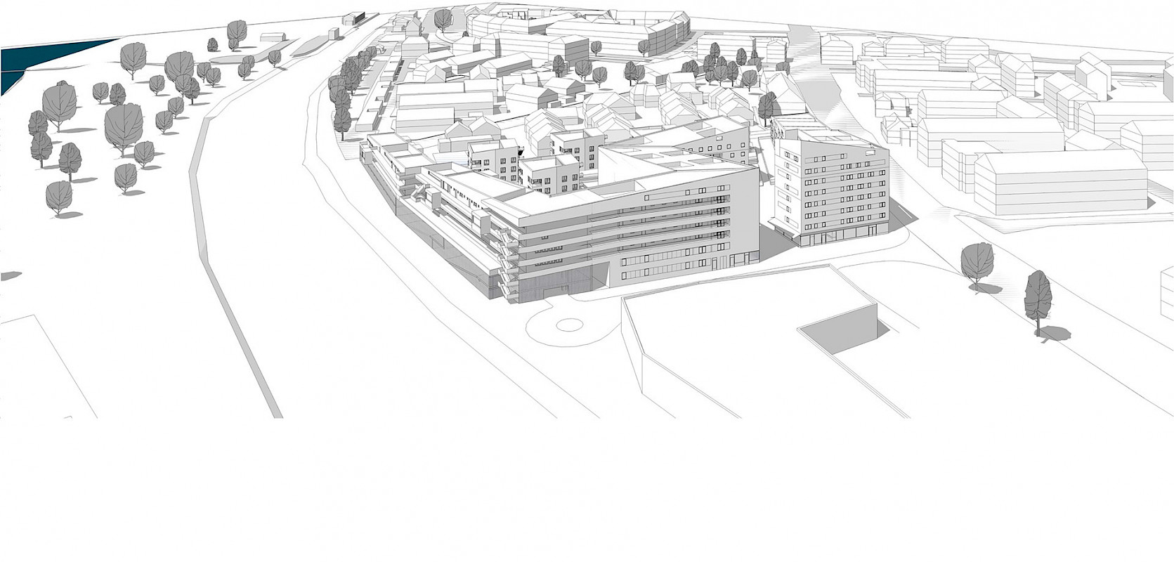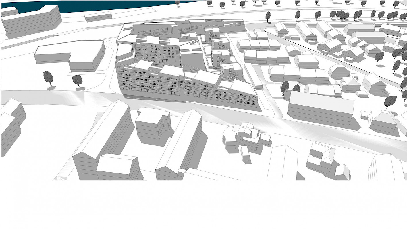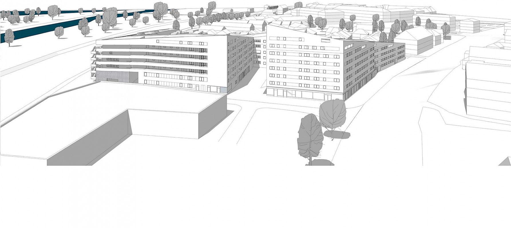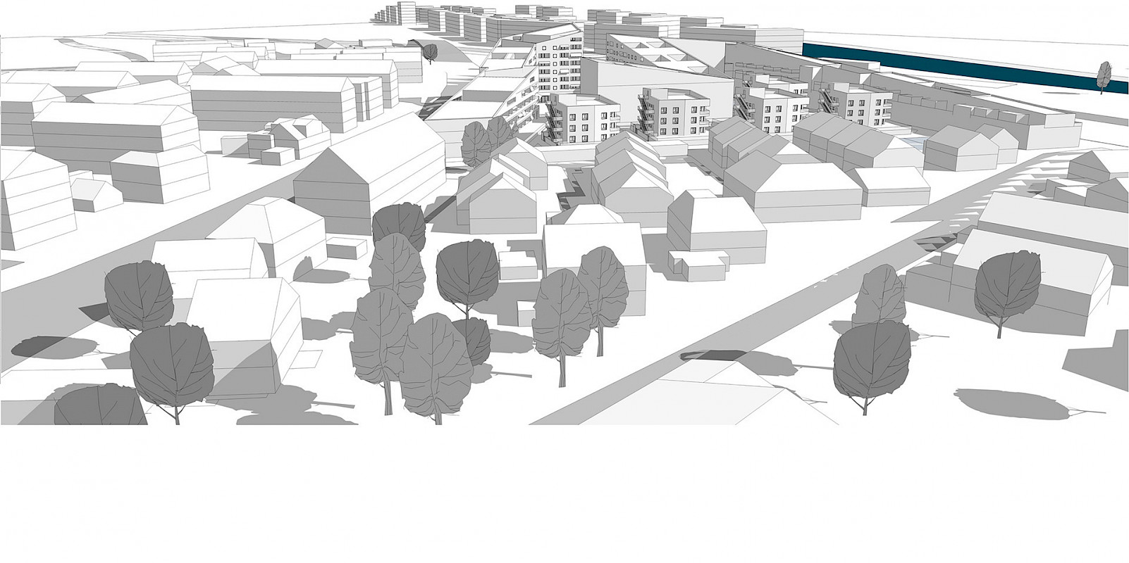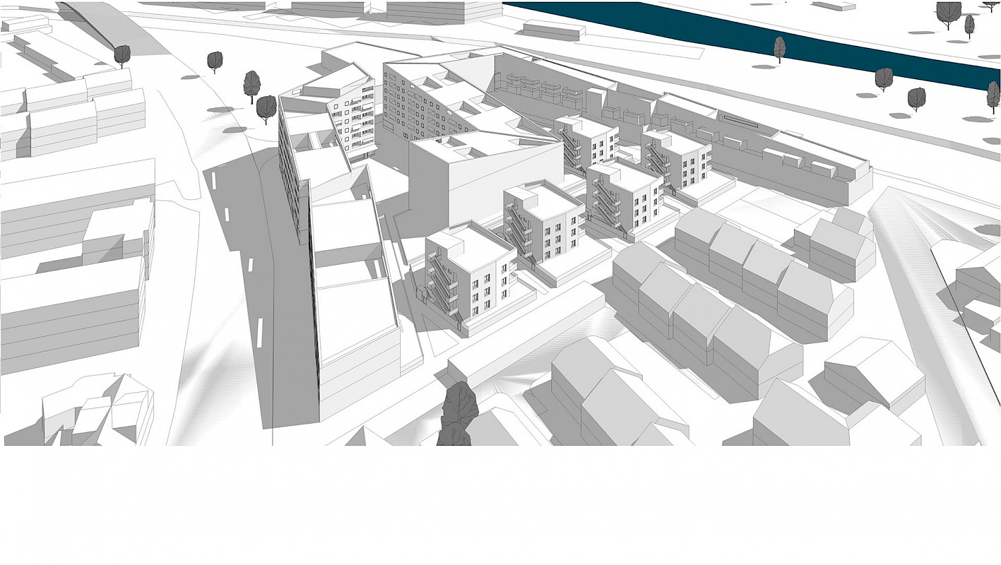 An der Schnittstelle zwischen Mainz-Kastel und Mainz Kostheim schlagen die Verfasser einen Stadtquartier vor, welches sich allseitig angemessen auf das jeweilige Gegenüber bezieht, d.h. die Quartierskanten bleiben geschlossen, dort wo es der Schallschutz erfordert und werden geöffnet, wo es quartiersübergreifende Bezüge gibt. Trotz der Kantenlängen von ca. 110 m gelingt es den Blockrand mittels Versätzen und Knicken an die ortsübliche Maßstäblichkeit anzugleichen. An den Anschlussstellen beziehen sich die Trauf- und Attikahöhen auf die unmittelbare Nachbarschaft (max. 3 Geschosse). Im weiteren Verlauf steigen die Dachkanten gleichmäßig an. Es entwickelt sich eine durchgängige Dachlandschaft und diese formt sich am Quartiersplatz zu einer markanten und von weitem wahrnehmbaren Silhouette mit bis zu 8 Geschossen an der höchsten Stelle. Der Quartiersplatz auf dem nordöstlichen Quadranten ist sowohl baulich über eine Passage an der Kostheimer Landstraße und einer Öffnung zum Bürgerhaus, als auch über sein öffentliches bzw. halböffentliches Nutzungsangebot, gut an den Stadtraum angebunden. Die restlichen drei Quadranten bieten im emissionsgeschützten Innenbereich ein ruhiges, autofreies und durchgängiges Kontinuum von Gartenräumen, besiedelt mit fünf dreigeschossigen Punkthäusern. Die Erschließung erfolgt über zwei parallele Wege und die Straße am Ostrand - somit ist das gesamte Wohnquartier an der Kostheimer Landstraße angebunden (Adressbildung). Das hier vorgeschlagene Bebauungskonzept weist eine GRZ von 0,4 auf. Im Sinne einer nachhaltigen Quartiersentwicklung wird wie folgt ein lebenswertes Wohnumfeld mit Aufenthalts- und Nutzungsqualitäten und eine ökologische Gestaltung der öffentlichen und privaten Grün-/ Freiflächen zur Stärkung der Biodiversität vorgeschlagen: