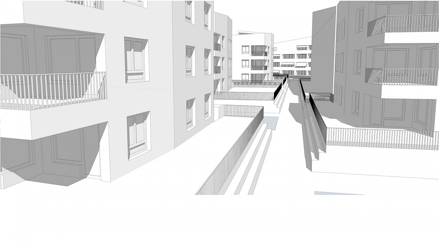 Der autofreie Innenbereich ist als Freiflächenkontinuum angelegt - vom Kindergarten-Freiraum über die kleinen „Kiezplätze“ (zwischen den Hauseingängen), bis hin zu den Mietergärten. Alle EG-Wohnungen liegen im Hochparterre und abgesehen von den EG-Wohnungen entlang der östlichen Erschließungsstraße und dem Quartiersplatz, haben alle Wohnungen höhengleiche Zugänge zu den Mietergärten. Weil diese Gliederung von halbprivat zu privat den Bewohnern alle Möglichkeiten der Kommunikation und des Rückzugs bietet, wird sich ein verantwortungsvoller Umgang mit den Außenräumen einstellen - die Bewohner werden sich mit ihrem Kiez identifizieren.