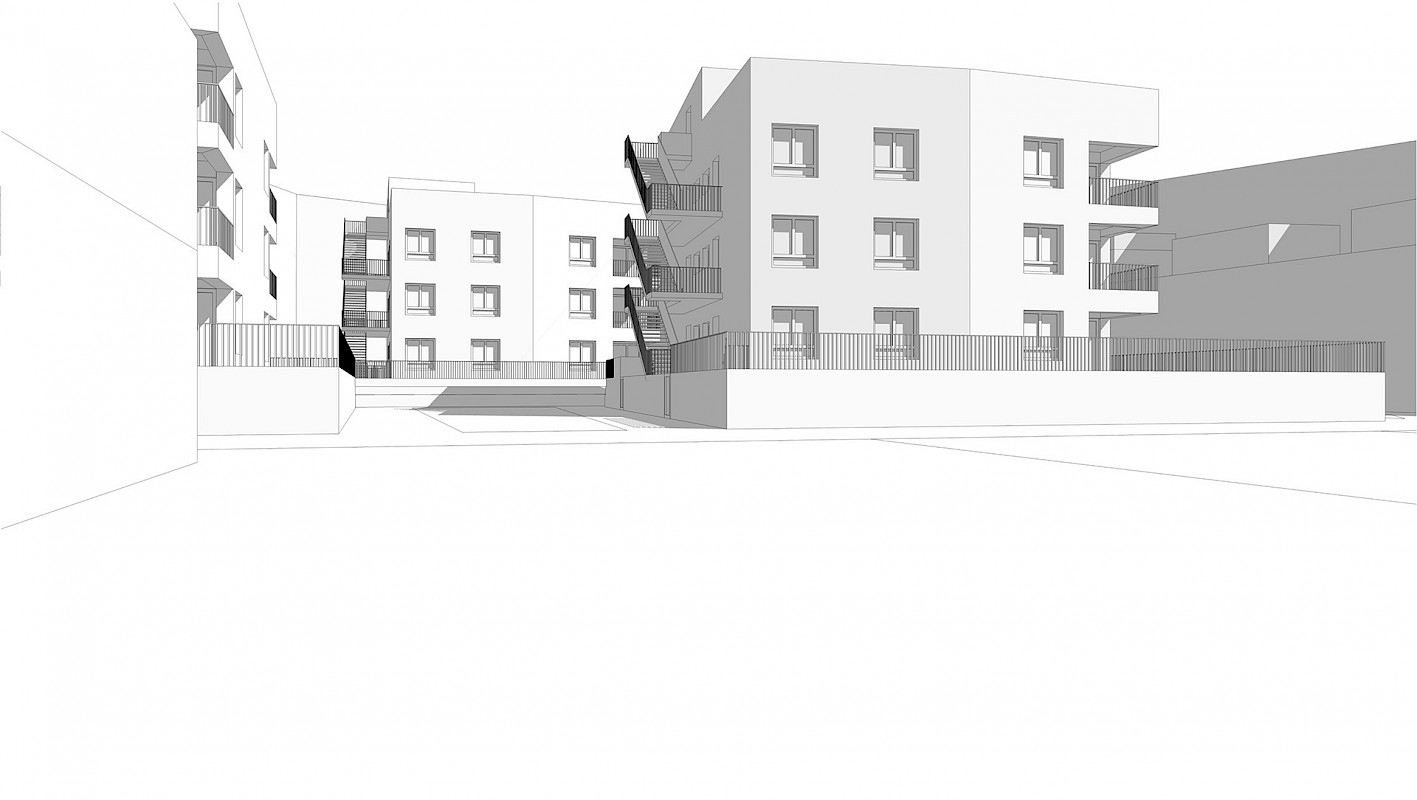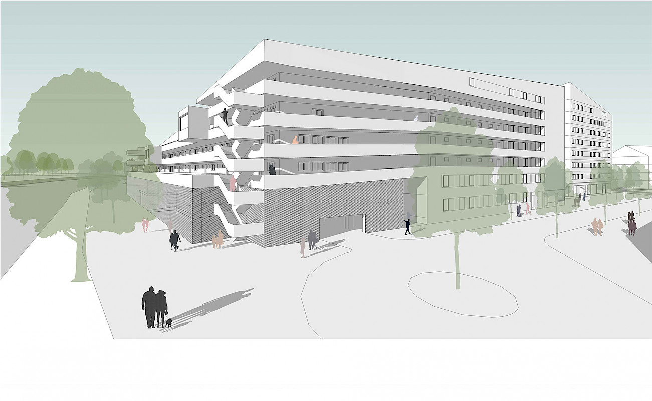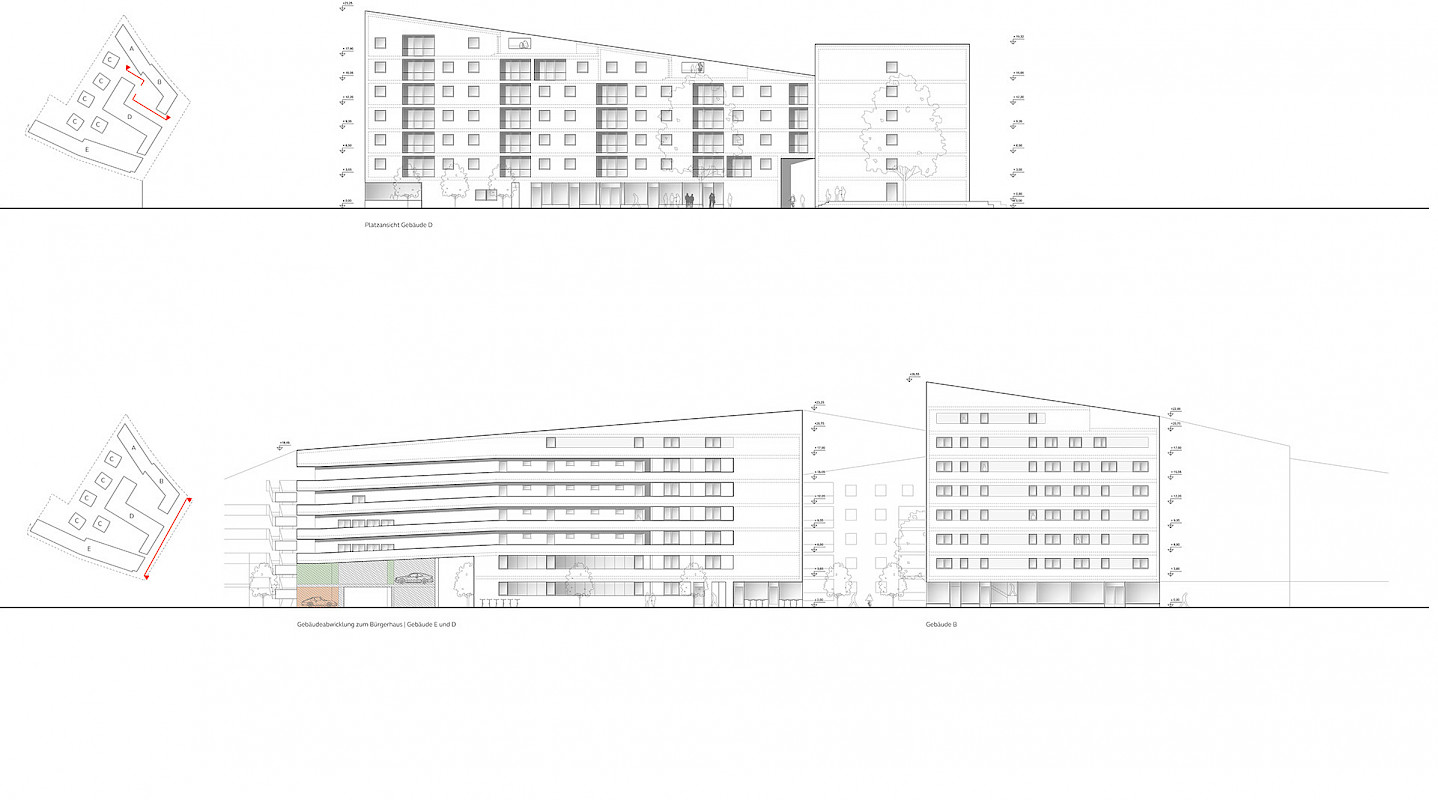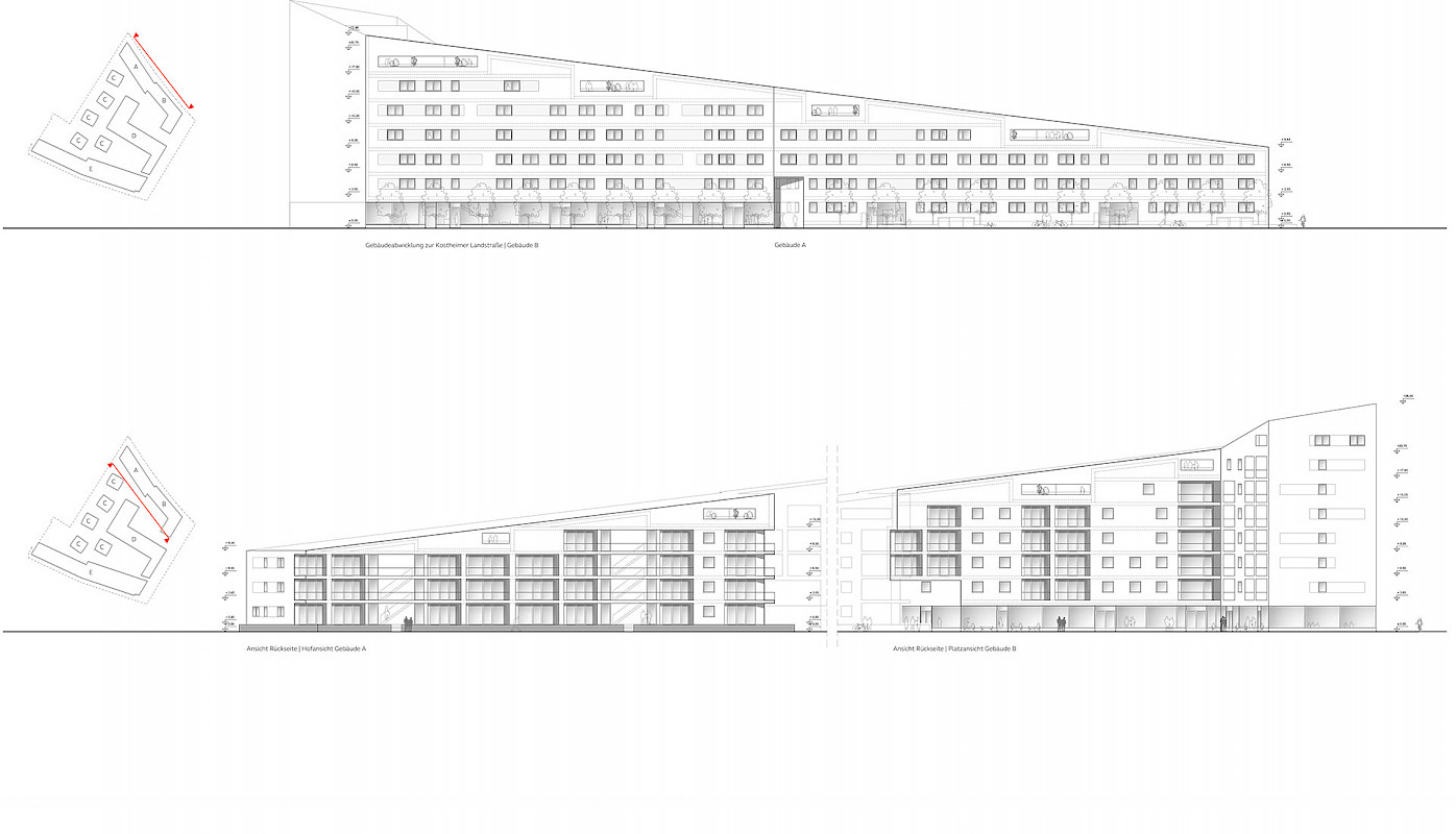 Gebäude A: Die Hauseingänge sind zur Kostheimer Landstraße gelegen. In den Geschossen befinden sich familiengerechte 4 ZKB, 5 ZKB und altersgerechte 2 ZKB (2 Pers., barrierefrei) Wohnungen. Die Wohnungen werden als Vierspänner über ein außenliegendes Treppenhaus erschlossen, was ein sehr gutes Wohnflächen-/ Erschließungsflächenverhältnis erzeugt. Sämtliche Wohnräume und Loggien sind zum Innenbereich hin orientiert. Das Erdgeschoss ist 0,8 m über das angrenzende Terrain abgehoben, ebenso die angrenzenden Mietergärten wodurch eine natürliche Trennung der halböffentlichen und privaten Bereiche erzeugt wird. Für die Wohnungen, welche ausschließlich zum Innenbereich gelegen sind, wird ein zweiter baulicher Rettungsweg hergestellt. Gebäude B (Vierspänner): Die Hauseingänge sind zur Kostheimer Landstraße und zum Bürgerhaus gelegen. Im Erdgeschoss sind die geforderten Gewerbeflächen untergebracht. Zusätzlich zu der Bäckerei, dem Gemeinschaftsraum für das Wohnprojekt, dem Waschsalon, dem Co-Working-Bereich und der Fahrradwerkstatt wird eine Gastronomiefläche vorgeschlagen. Die Wohnungen werden als Ein- bis Vierspänner über ein außen liegendes Treppenhaus erschlossen. In den Obergeschossen, welche sich parallel zur Kostheimer Landstraße befinden, sind die Low-Cost-Wohngemeinschaften, die Clusterwohnungen, 2 ZKB (1 Pers., barrierefrei), 2 ZKB (2 Pers., barrierefrei), 3 ZKB, 4 ZKB, und eine 6 ZKB Wohnungen untergebracht. In dem Gebäudeteil, welches parallel zum Bürgerhaus gelegen ist befindet sich in den Obergeschossen das Wohnprojekt mit 2 ZKB (1 Pers.) und 2 ZKB (2 Pers.) Wohnungen, sowie weitere 2 ZKB, eine 5 ZKB und eine 6 ZKB Wohnung. Sämtliche Wohnräume und Loggien sind zum Innenbereich / Quartiersplatz hin orientiert. Durch die schräge (terrassierte) Ausformung des Dachbereichs entsteht ein differenziertes Angebot von Dachgeschosswohnungen mit Dachterrassen und –gärten (Patiowohnungen). Gebäude C (Zweispänner): Die Punkthäuser haben offene, außen liegende Treppenhäuser (Zweispänner). In den Punkthäusern sind familiengerechte 4 ZKB Wohnungen untergebracht. Die Mietergärten sind 1,4 m vom angrenzenden Terrain abgehoben. Auf dem Dach werden gemeinschaftliche Flächen angeboten. Gebäude D (Innengang-/ Laubenganghaus): Für die Wohnnutzung sind ein Hauseingang am Quartiersplatz und ein Hauseingang an der Straße zum Bürgerhaus gelegen. Im mittleren Bereich des Erdgeschosses ist die Kindertagesstätte positioniert, deren Haupteingang zum Quartiersplatz gelegen ist. Die Gruppenräume sind nach Süden zu dem 726 m² großen Freibereich orientiert. Die Geschosse des Innenganghauses werden über drei Treppenhäuser angedient. Die Flure werden im Bereich zum Bürgerhaus zu Laubengängen und sind größtenteils mit dem Gebäude E und dadurch mit der Quartiersgarage verbunden. In den Geschossen befindet sich ein differenzierter Mix aus 2 ZKB (1 Pers., barrierefrei), 2 ZKB (2 Pers., barrierefrei), 2 ZKB (2 Pers.), 3 ZKB (barrierefrei), 3 ZKB, 4 ZKB, 5 ZKB (barrierefrei) und 5 ZKB Wohnungen. Einem Teil der Wohnungen sind Mietergärten zugewiesen. Sämtliche Wohnräume und Loggien sind zum Innenbereich bzw. Quartiersplatz hin orientiert. Auch hier sind das Erdgeschoss und die Mietergärten 0,8 m vom angrenzenden Terrain abgehoben. Auch die Dächer des Gebäudes D sind schräg (terrassiert) ausformuliert, wodurch das Angebot von Penthouse Wohnungen mit Dachterrassen und -gärten ergänzt wird. Gebäude E (Laubenganghaus): Im Erd- und 1. Obergeschoss des Gebäudes ist die Quartiersgarage mit insgesamt 160 Stellplätzen untergebracht. Die Wohnungen werden über Laubengänge angedient. An den Laubengängen sind zwei Treppenhäuser gelegen. In den Geschossen wird ein Mix aus 2 ZKB (2 Pers.), 3 ZKB, 4 ZKB und 5 ZKB Wohnungen angeboten. Sämtliche Wohnräume und Freisitze sind zum Innenbereich hin orientiert. Durch die schräge Ausformulierung der Freisitze und Fassaden der Wohnräume haben diese eine optimale Ausrichtung nach Westen. Auch in diesem Gebäude gibt es ein Angebot von Dachgeschosswohnungen mit Dachterrassen. Im 2. und 3. Obergeschoss werden Mietergärten für „Urban Gardening“ angeboten.