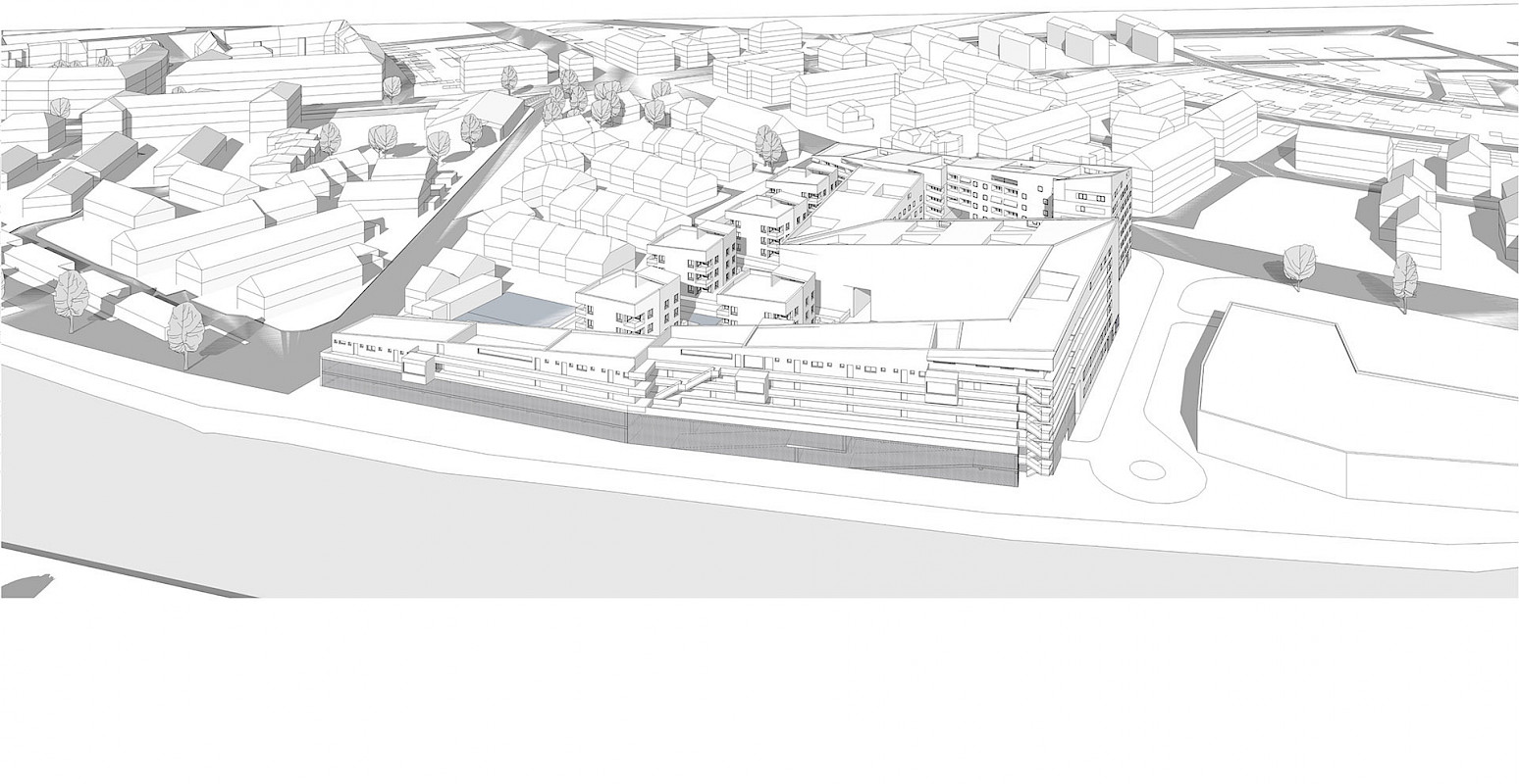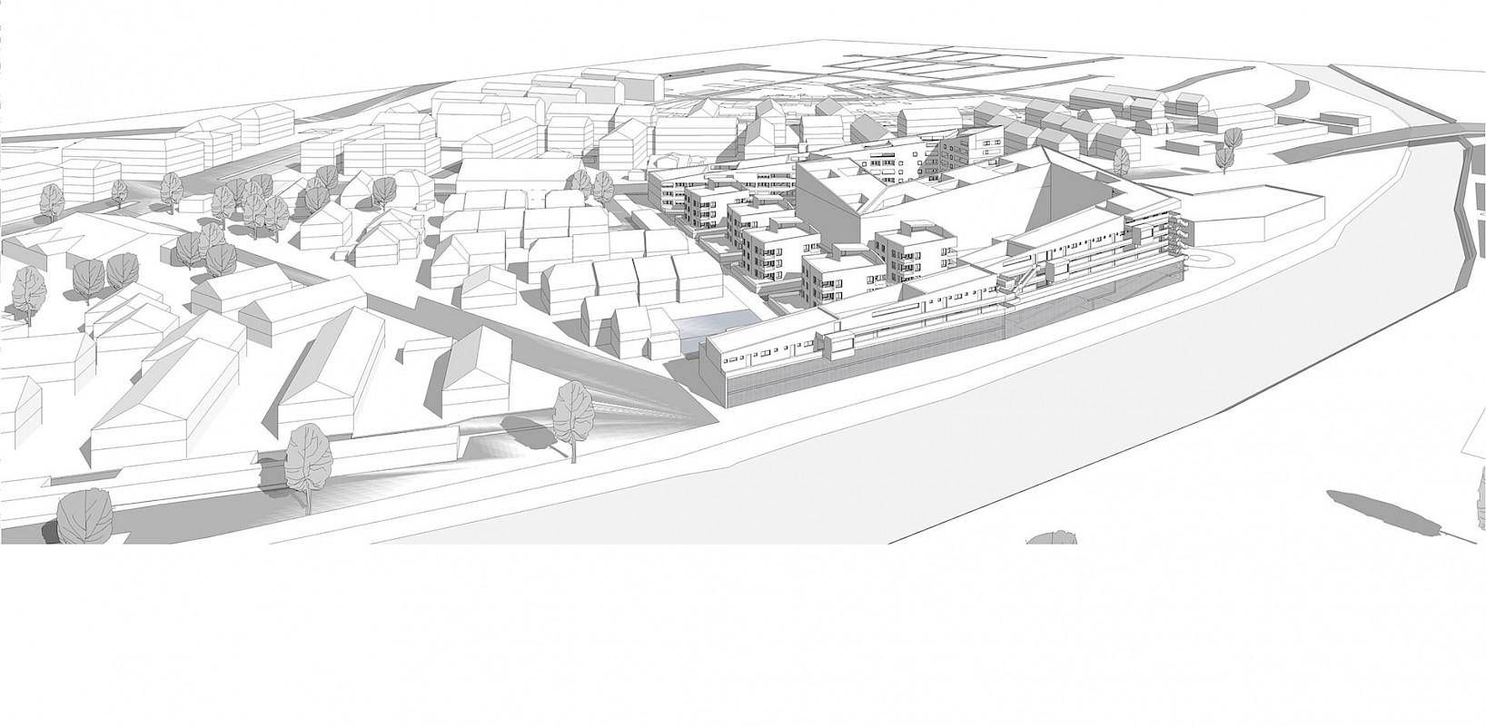 Ausgangsbasis des Energiekonzeptes ist die Minimierung des Energieverbrauchs und bevorzugte Verwendung regenerativer Energie. Aufgrund der besonderen Nähe zum Rhein erscheint die Geothermienutzung zur Gebäudeheizung inkl. Aufbau eines sogenannten „Kalten-Nahwärmenetzes“ sinnvoll. Ziel dieser Konzeption soll der komplette Verzicht auf den Einsatz fossiler Brennstoffe wie z. B. Erdgas, Erdöl sein. Entgegen einer Wärmeversorgung über ein klassisches Fernwärme-/Nahwärme-Netz mit Vorlauftemperaturen von 70 bis 90 °C, wird das „Kalte-Nahwärmenetz“ nur mit Temperaturen von etwa 5 bis 25 °C betrieben. Durch die Sonden- und Versorgungsleitungen zirkuliert ein Wasser-Glykol-Gemisch (Sole) und nimmt die Temperatur des Erdreichs auf. Ein- oder mehrere zentrale Bohrfelder dienen dabei als gemeinschaftliche Wärmequelle für die Versorgung einzelner Verbraucher bzw. Gebäude. Über eine separate Verteilstation erfolgt die Anbindung an ein zentrales Ringleitungssystem. Dieses Versorgungsnetz transportiert die aus der Wärmequelle gewonnene Energie, zu den dezentral angeordneten Wärmepumpenanlagen in den Haustechnikräumen der jeweiligen Gebäude. Optionale PV-Anlagen auf den Dächern und im speziellen an der Südfassade des Gebäude-E zur Bahntrasse, liefern den elektrischen Strom für den Betrieb der Wärmeversorgungsanlage. Dachflächen Für die Dachfläche wird - in Abhängigkeit mit dem gewählten Energiekonzept - beim Einsatz von Solarenergie ein Solargründach vorgeschlagen. Dadurch wird gewährleistet, dass die komplette Dachfläche begrünt werden kann bei der gleichzeitigen Nutzung der Sonnenenergie.