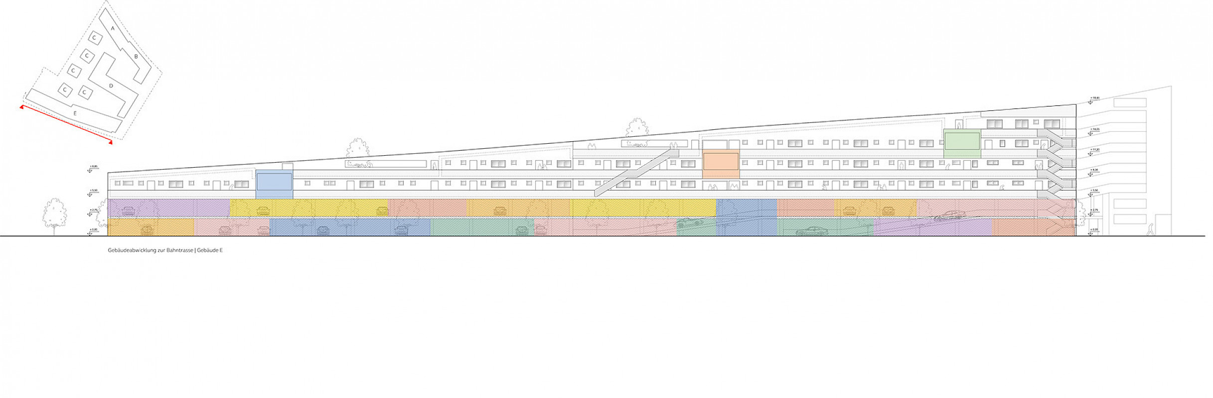 Gebäude A: Die Hauseingänge sind zur Kostheimer Landstraße gelegen. In den Geschossen befinden sich familiengerechte 4 ZKB, 5 ZKB und altersgerechte 2 ZKB (2 Pers., barrierefrei) Wohnungen. Die Wohnungen werden als Vierspänner über ein außenliegendes Treppenhaus erschlossen, was ein sehr gutes Wohnflächen-/ Erschließungsflächenverhältnis erzeugt. Sämtliche Wohnräume und Loggien sind zum Innenbereich hin orientiert. Das Erdgeschoss ist 0,8 m über das angrenzende Terrain abgehoben, ebenso die angrenzenden Mietergärten wodurch eine natürliche Trennung der halböffentlichen und privaten Bereiche erzeugt wird. Für die Wohnungen, welche ausschließlich zum Innenbereich gelegen sind, wird ein zweiter baulicher Rettungsweg hergestellt. Gebäude B (Vierspänner): Die Hauseingänge sind zur Kostheimer Landstraße und zum Bürgerhaus gelegen. Im Erdgeschoss sind die geforderten Gewerbeflächen untergebracht. Zusätzlich zu der Bäckerei, dem Gemeinschaftsraum für das Wohnprojekt, dem Waschsalon, dem Co-Working-Bereich und der Fahrradwerkstatt wird eine Gastronomiefläche vorgeschlagen. Die Wohnungen werden als Ein- bis Vierspänner über ein außen liegendes Treppenhaus erschlossen. In den Obergeschossen, welche sich parallel zur Kostheimer Landstraße befinden, sind die Low-Cost-Wohngemeinschaften, die Clusterwohnungen, 2 ZKB (1 Pers., barrierefrei), 2 ZKB (2 Pers., barrierefrei), 3 ZKB, 4 ZKB, und eine 6 ZKB Wohnungen untergebracht. In dem Gebäudeteil, welches parallel zum Bürgerhaus gelegen ist befindet sich in den Obergeschossen das Wohnprojekt mit 2 ZKB (1 Pers.) und 2 ZKB (2 Pers.) Wohnungen, sowie weitere 2 ZKB, eine 5 ZKB und eine 6 ZKB Wohnung. Sämtliche Wohnräume und Loggien sind zum Innenbereich / Quartiersplatz hin orientiert. Durch die schräge (terrassierte) Ausformung des Dachbereichs entsteht ein differenziertes Angebot von Dachgeschosswohnungen mit Dachterrassen und –gärten (Patiowohnungen). Gebäude C (Zweispänner): Die Punkthäuser haben offene, außen liegende Treppenhäuser (Zweispänner). In den Punkthäusern sind familiengerechte 4 ZKB Wohnungen untergebracht. Die Mietergärten sind 1,4 m vom angrenzenden Terrain abgehoben. Auf dem Dach werden gemeinschaftliche Flächen angeboten. Gebäude D (Innengang-/ Laubenganghaus): Für die Wohnnutzung sind ein Hauseingang am Quartiersplatz und ein Hauseingang an der Straße zum Bürgerhaus gelegen. Im mittleren Bereich des Erdgeschosses ist die Kindertagesstätte positioniert, deren Haupteingang zum Quartiersplatz gelegen ist. Die Gruppenräume sind nach Süden zu dem 726 m² großen Freibereich orientiert. Die Geschosse des Innenganghauses werden über drei Treppenhäuser angedient. Die Flure werden im Bereich zum Bürgerhaus zu Laubengängen und sind größtenteils mit dem Gebäude E und dadurch mit der Quartiersgarage verbunden. In den Geschossen befindet sich ein differenzierter Mix aus 2 ZKB (1 Pers., barrierefrei), 2 ZKB (2 Pers., barrierefrei), 2 ZKB (2 Pers.), 3 ZKB (barrierefrei), 3 ZKB, 4 ZKB, 5 ZKB (barrierefrei) und 5 ZKB Wohnungen. Einem Teil der Wohnungen sind Mietergärten zugewiesen. Sämtliche Wohnräume und Loggien sind zum Innenbereich bzw. Quartiersplatz hin orientiert. Auch hier sind das Erdgeschoss und die Mietergärten 0,8 m vom angrenzenden Terrain abgehoben. Auch die Dächer des Gebäudes D sind schräg (terrassiert) ausformuliert, wodurch das Angebot von Penthouse Wohnungen mit Dachterrassen und -gärten ergänzt wird. Gebäude E (Laubenganghaus): Im Erd- und 1. Obergeschoss des Gebäudes ist die Quartiersgarage mit insgesamt 160 Stellplätzen untergebracht. Die Wohnungen werden über Laubengänge angedient. An den Laubengängen sind zwei Treppenhäuser gelegen. In den Geschossen wird ein Mix aus 2 ZKB (2 Pers.), 3 ZKB, 4 ZKB und 5 ZKB Wohnungen angeboten. Sämtliche Wohnräume und Freisitze sind zum Innenbereich hin orientiert. Durch die schräge Ausformulierung der Freisitze und Fassaden der Wohnräume haben diese eine optimale Ausrichtung nach Westen. Auch in diesem Gebäude gibt es ein Angebot von Dachgeschosswohnungen mit Dachterrassen. Im 2. und 3. Obergeschoss werden Mietergärten für „Urban Gardening“ angeboten.