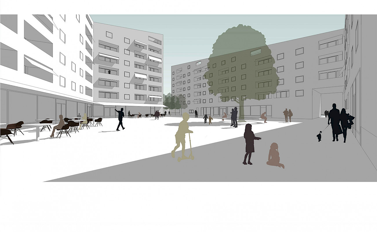 Der Quartiersplatz im nordöstlichen Quadranten wird als Schnittstelle zum angrenzenden Stadtraum ausgebildet. Dieser barrierefrei erreichbaren und von der Kostheimer Landstraße abgeschirmten Platzfläche, sind erdgeschossig alle Sondernutzungen wie Kindertagesstätte, Bäckereishop, Fahrradservicestation, Waschsalon, Co-Working-Space, Gastronomie und der Gemeinschaftsraum (Wohngruppe) zugeordnet. Um eine große Dorflinde herum laden, an den Platzkanten, Schaufensteranlagen mit einem sinnvoll kombinierten und attraktiven Nutzungsangebot zum Verweilen und Austausch ein. Diese wohldimensionierte Platzfläche öffnet sich diagonal auf der einen Seite zum Kinderspielplatz und zum ruhigen Innenbereich und auf der anderen Seite geht sie in den Bereich Bürgerhaus über.