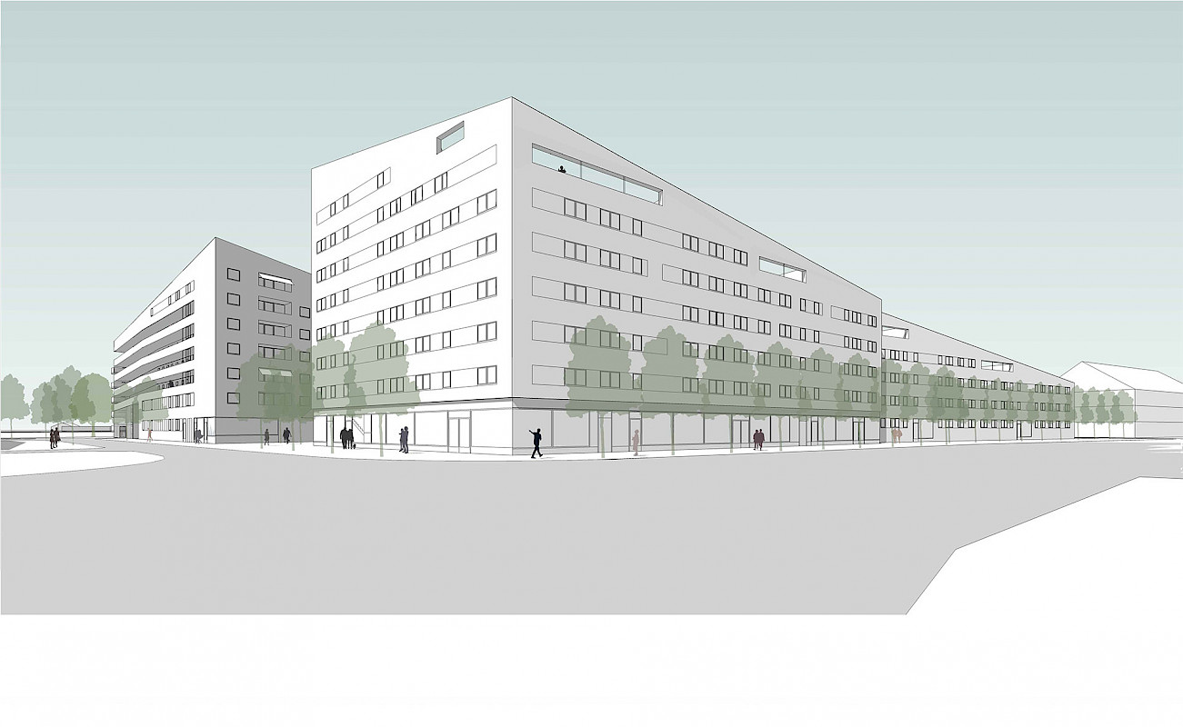 An der Schnittstelle zwischen Mainz-Kastel und Mainz Kostheim schlagen die Verfasser einen Stadtquartier vor, welches sich allseitig angemessen auf das jeweilige Gegenüber bezieht, d.h. die Quartierskanten bleiben geschlossen, dort wo es der Schallschutz erfordert und werden geöffnet, wo es quartiersübergreifende Bezüge gibt. Trotz der Kantenlängen von ca. 110 m gelingt es den Blockrand mittels Versätzen und Knicken an die ortsübliche Maßstäblichkeit anzugleichen. An den Anschlussstellen beziehen sich die Trauf- und Attikahöhen auf die unmittelbare Nachbarschaft (max. 3 Geschosse). Im weiteren Verlauf steigen die Dachkanten gleichmäßig an. Es entwickelt sich eine durchgängige Dachlandschaft und diese formt sich am Quartiersplatz zu einer markanten und von weitem wahrnehmbaren Silhouette mit bis zu 8 Geschossen an der höchsten Stelle. Der Quartiersplatz auf dem nordöstlichen Quadranten ist sowohl baulich über eine Passage an der Kostheimer Landstraße und einer Öffnung zum Bürgerhaus, als auch über sein öffentliches bzw. halböffentliches Nutzungsangebot, gut an den Stadtraum angebunden. Die restlichen drei Quadranten bieten im emissionsgeschützten Innenbereich ein ruhiges, autofreies und durchgängiges Kontinuum von Gartenräumen, besiedelt mit fünf dreigeschossigen Punkthäusern. Die Erschließung erfolgt über zwei parallele Wege und die Straße am Ostrand - somit ist das gesamte Wohnquartier an der Kostheimer Landstraße angebunden (Adressbildung). Das hier vorgeschlagene Bebauungskonzept weist eine GRZ von 0,4 auf. Im Sinne einer nachhaltigen Quartiersentwicklung wird wie folgt ein lebenswertes Wohnumfeld mit Aufenthalts- und Nutzungsqualitäten und eine ökologische Gestaltung der öffentlichen und privaten Grün-/ Freiflächen zur Stärkung der Biodiversität vorgeschlagen: